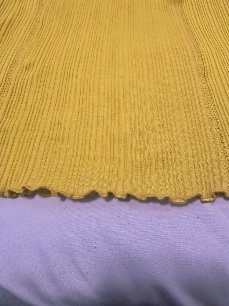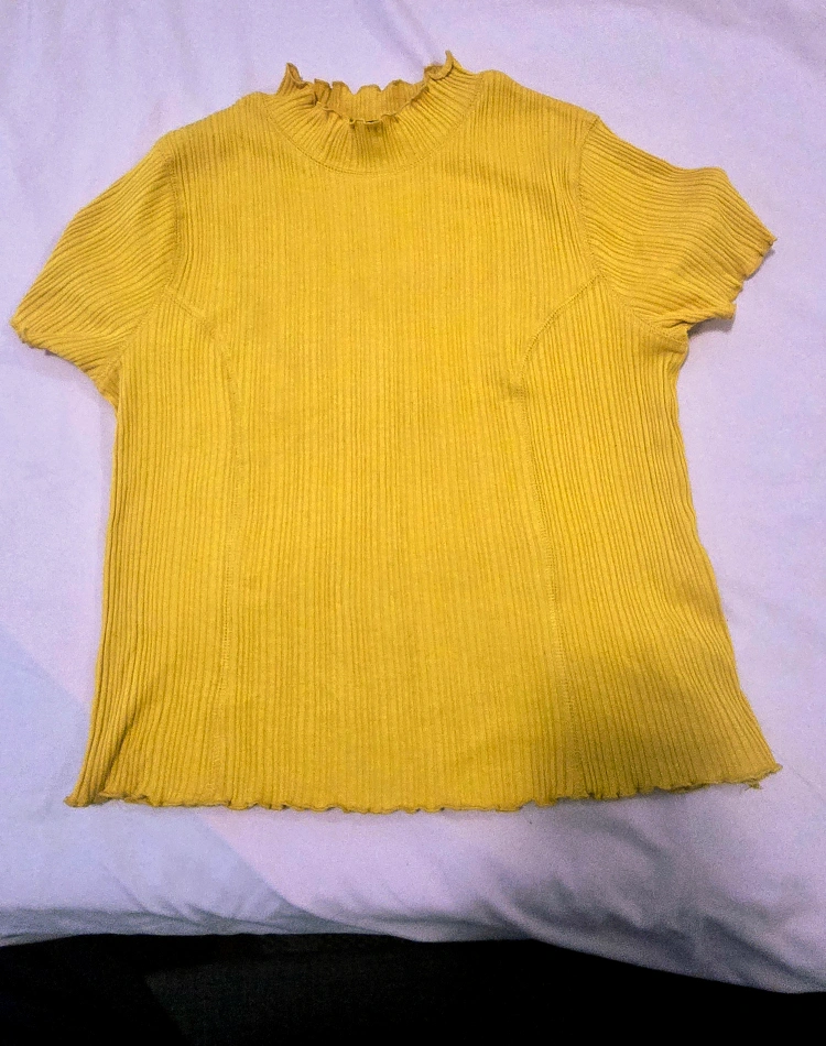 Here's a sunny yellow ribbed short-sleeve top! It's in great condition and ready for a new home. The ribbed texture adds a nice touch, and the colour is perfect for adding a pop to your wardrobe