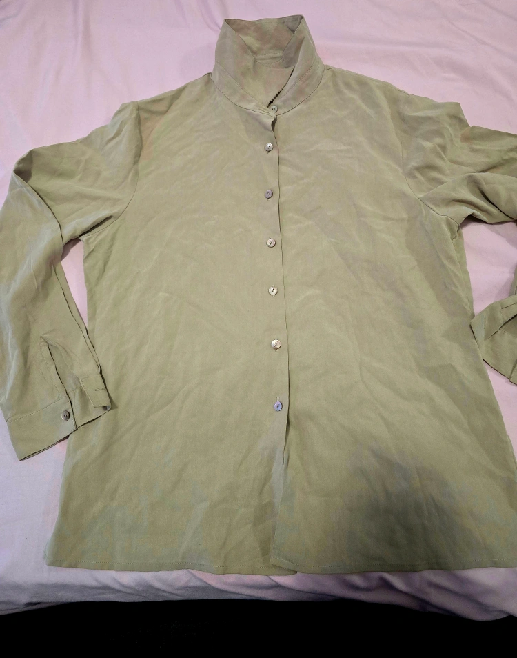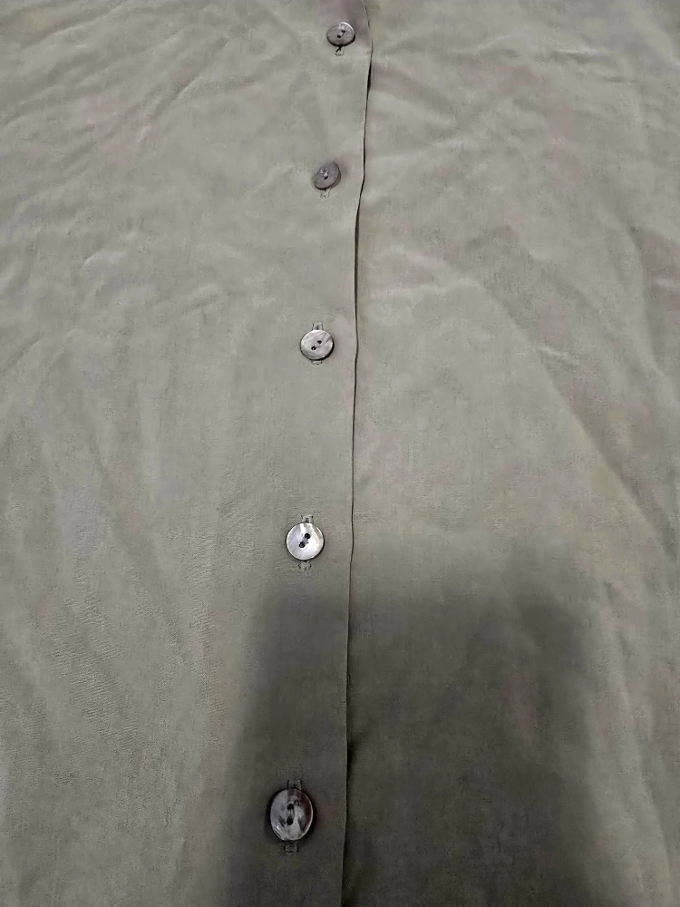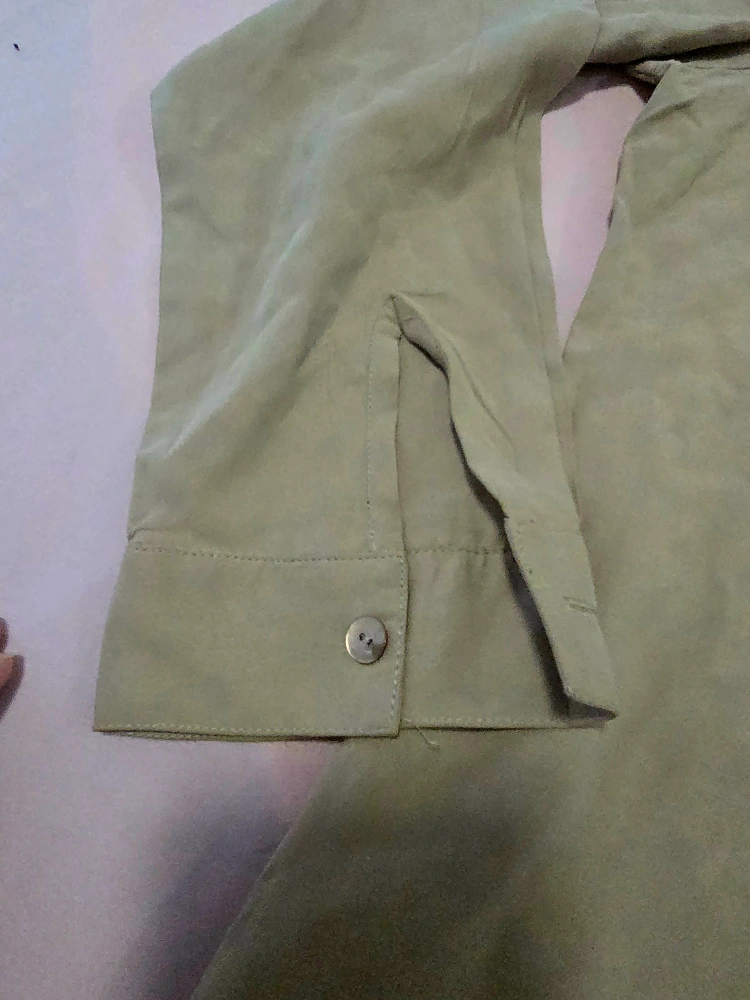 Selling a gently used olive green button-down blouse. It's in great condition and perfect for layering or wearing on its own. The material feels soft and comfortable. It's a stylish and versatile piece to add to your wardrobe!