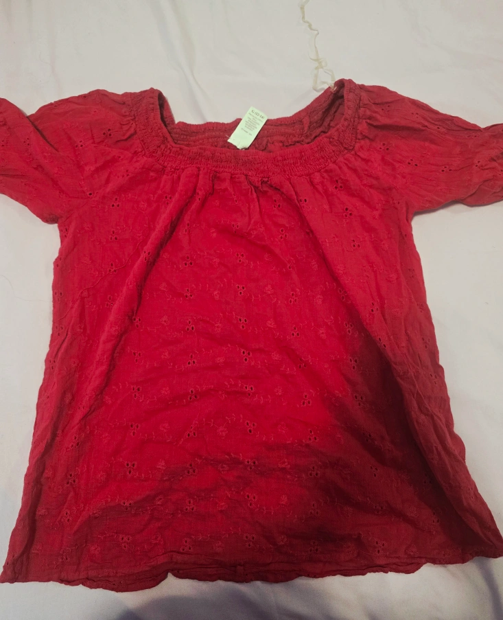A lovely red eyelet top in size small! It's in great condition and ready for a new home. The eyelet detailing adds a touch of elegance to this comfortable and stylish top