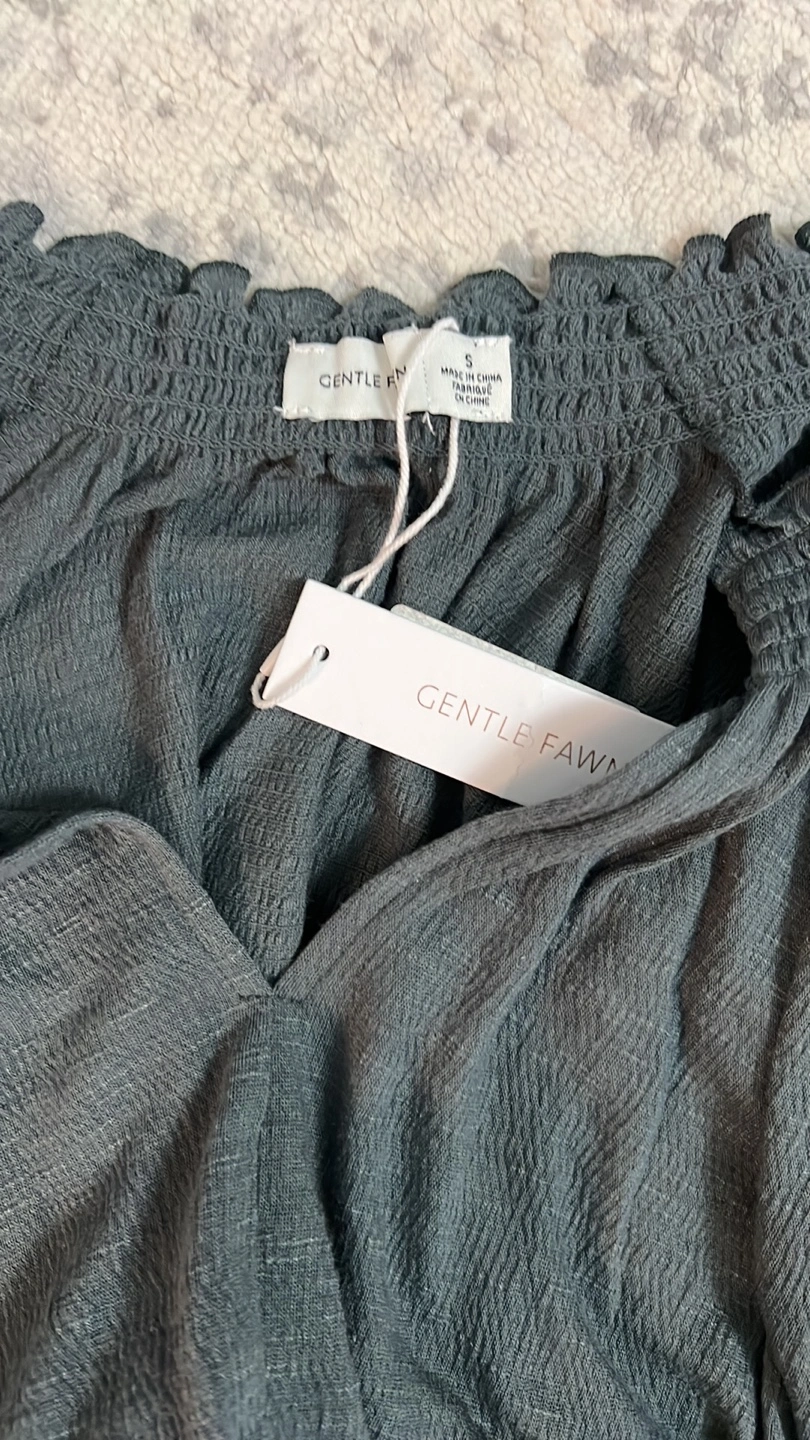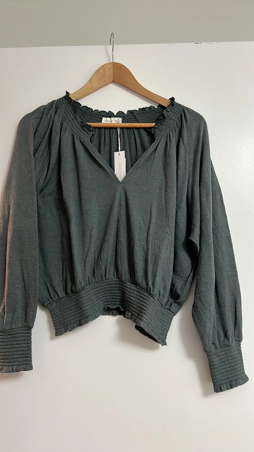 Selling a Gentle Fawn smocked top in size small! It's a lovely, comfortable piece that's perfect for everyday wear. The colour is a beautiful muted green, and it features a flattering V-neck design. Great for pairing with jeans or shorts!