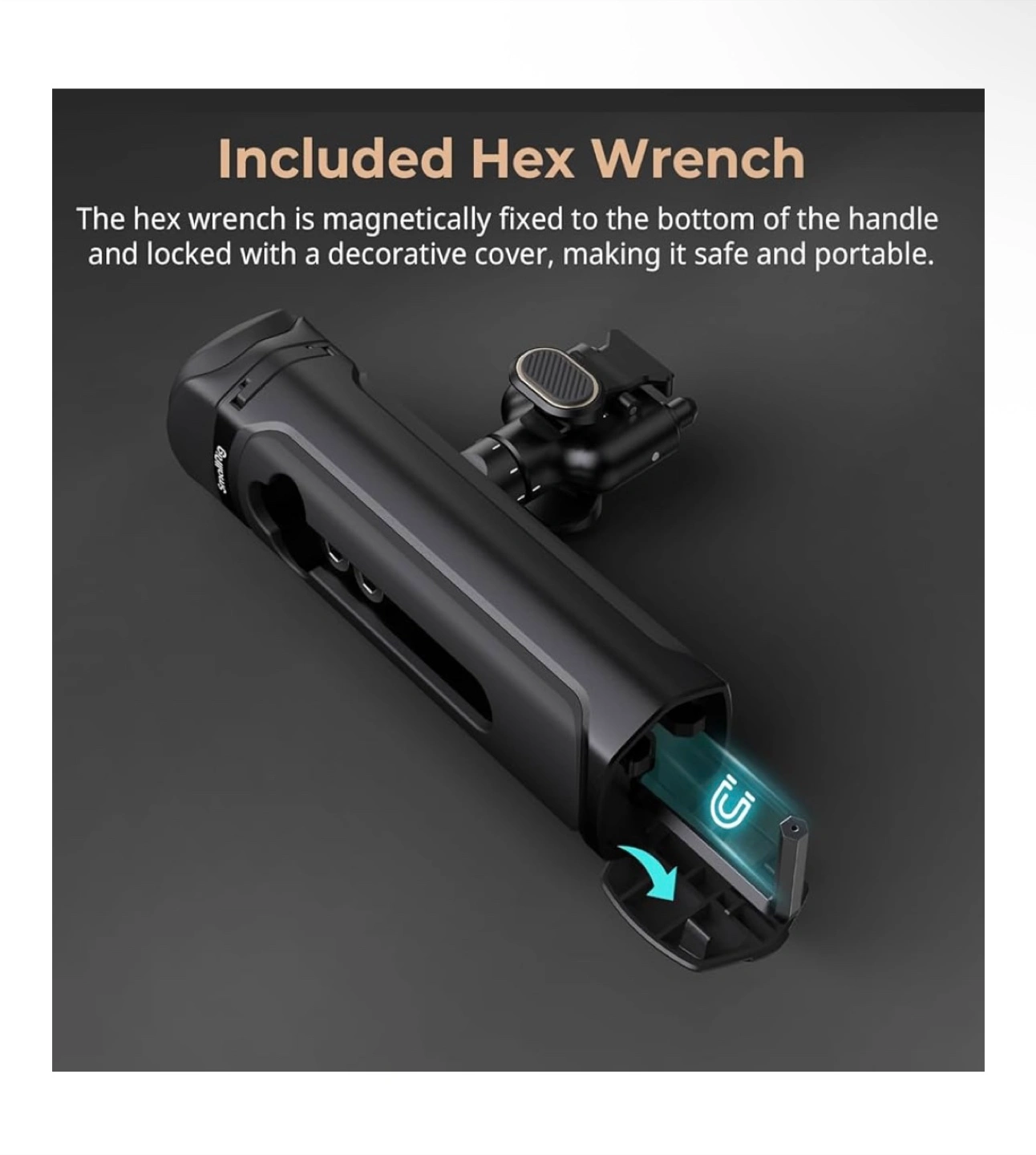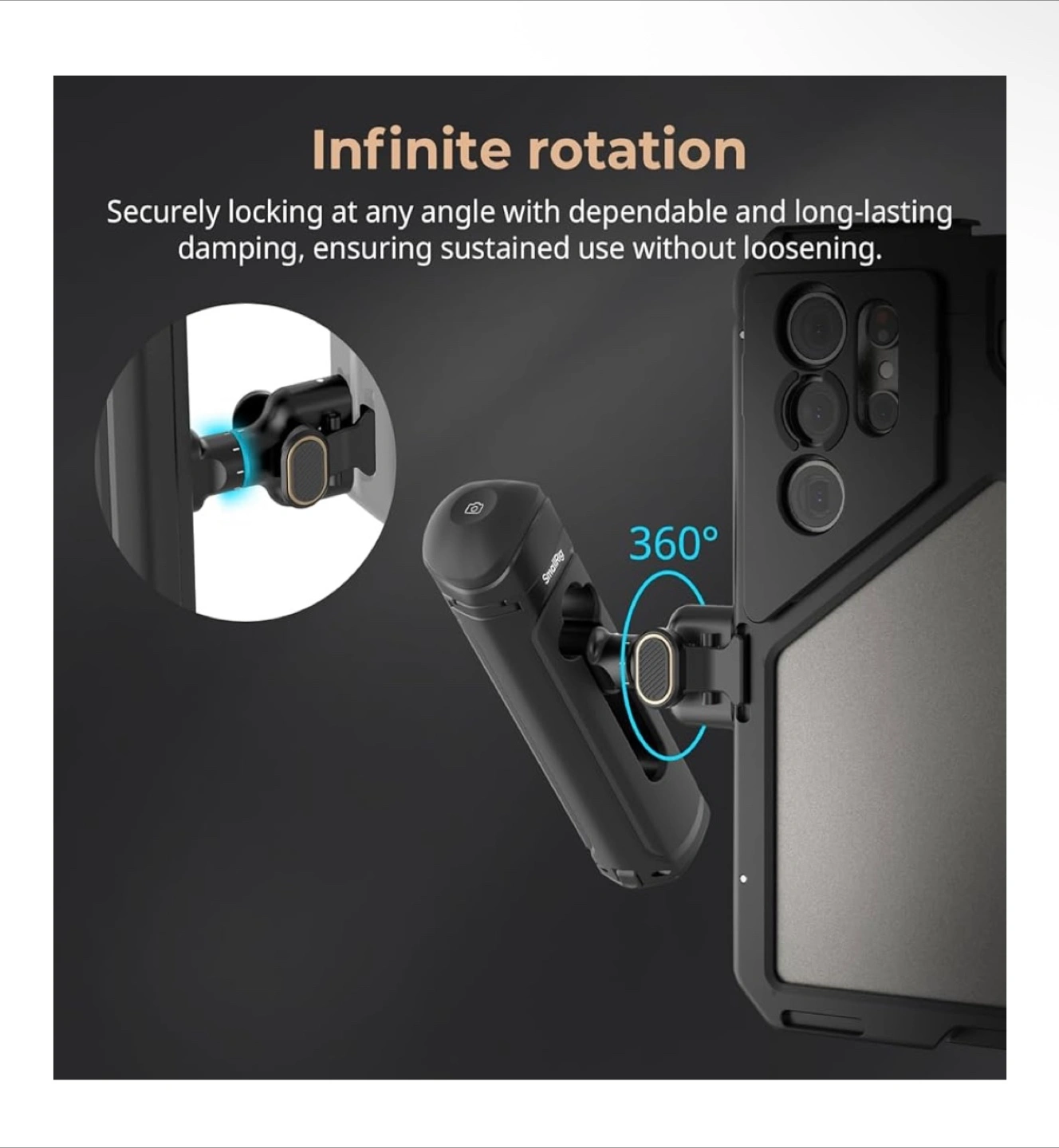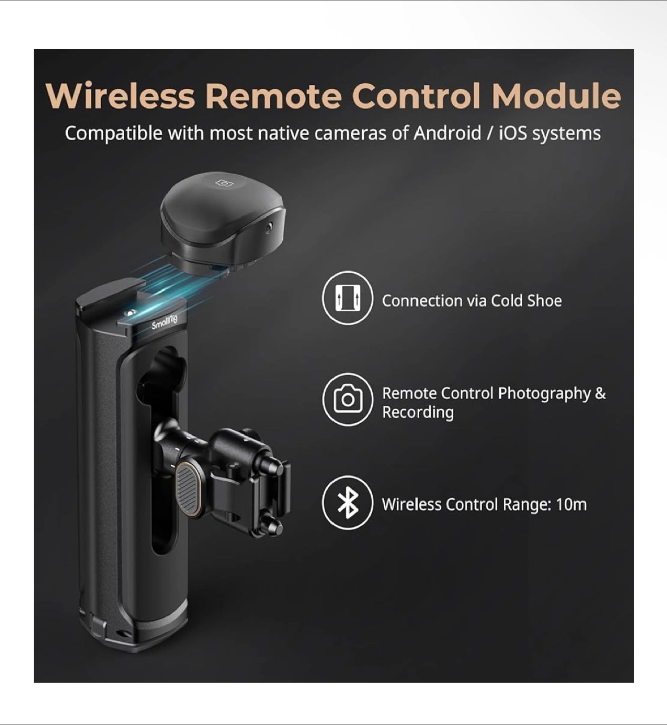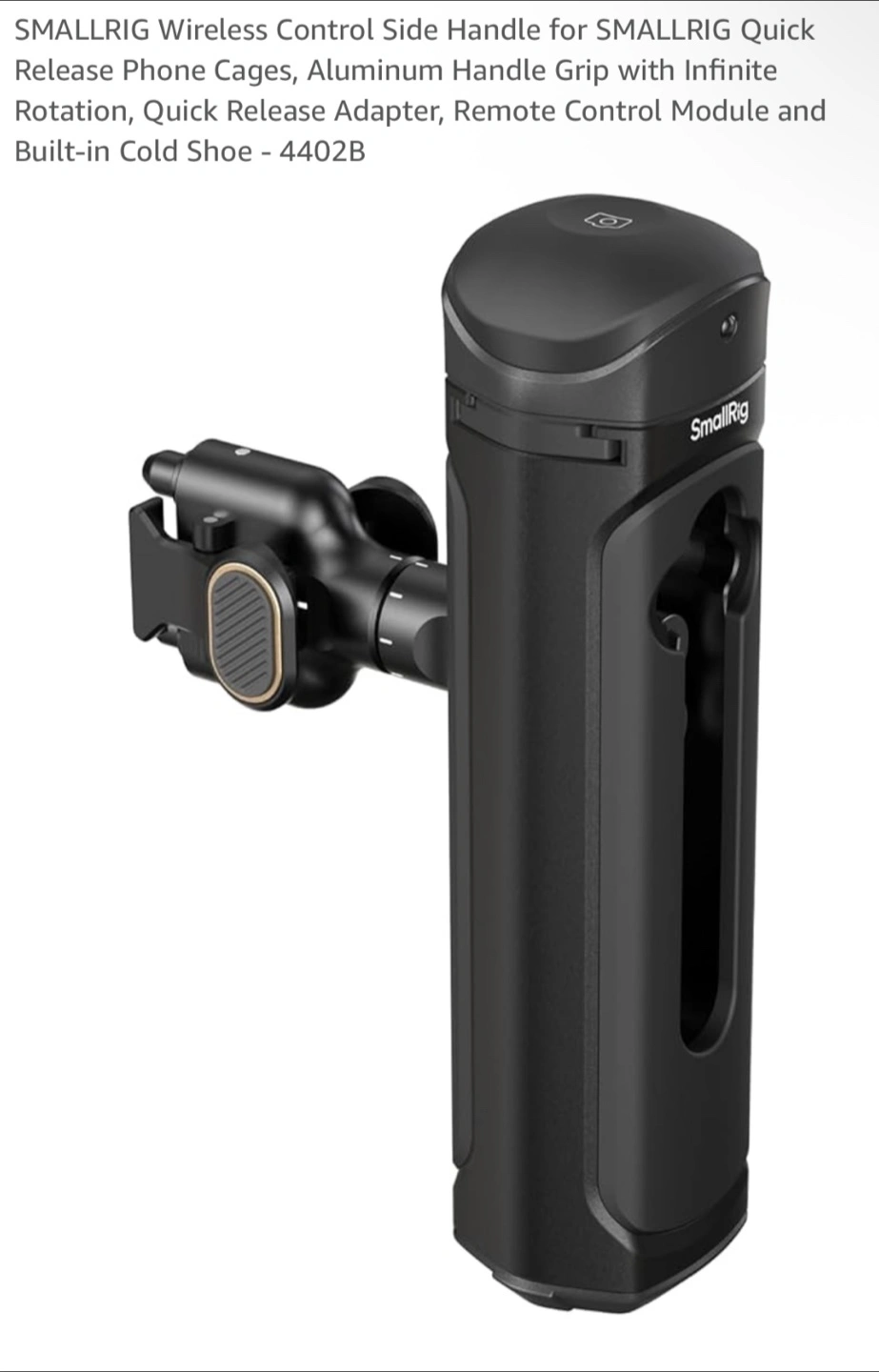 Selling a SmallRig Wireless Control Side Handle (model 4402B). This handle features infinite rotation, allowing secure locking at any angle for dependable and long-lasting damping. It also includes a hex wrench that is magnetically fixed to the bottom of the handle, making it safe and portable. Compatible with most native cameras of Android / iOS systems, it offers connection via Cold Shoe, remote control photography & recording, and has a wireless control range of 10m