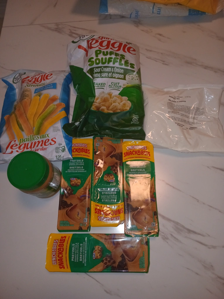 Giving away a mix of snacks including veggie puffs, veggie straws, pancake mix, peanut butter and Lunchables pretzels. Perfect for a quick bite or a snack on the go! Pick up only. Message if interested. Pick up is at Jane and Finch.