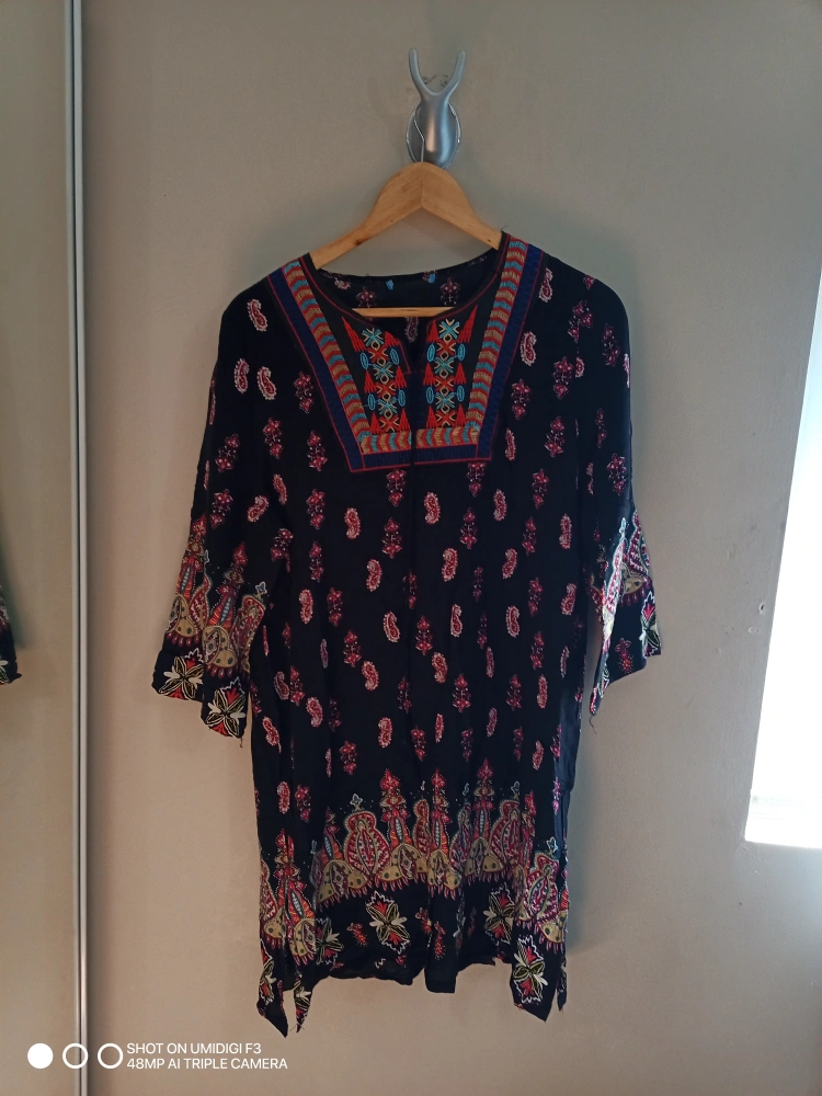 Cute black tunic top with a colourful print and embroidery detailing. It's in great condition and ready for a new home! final price pickup only