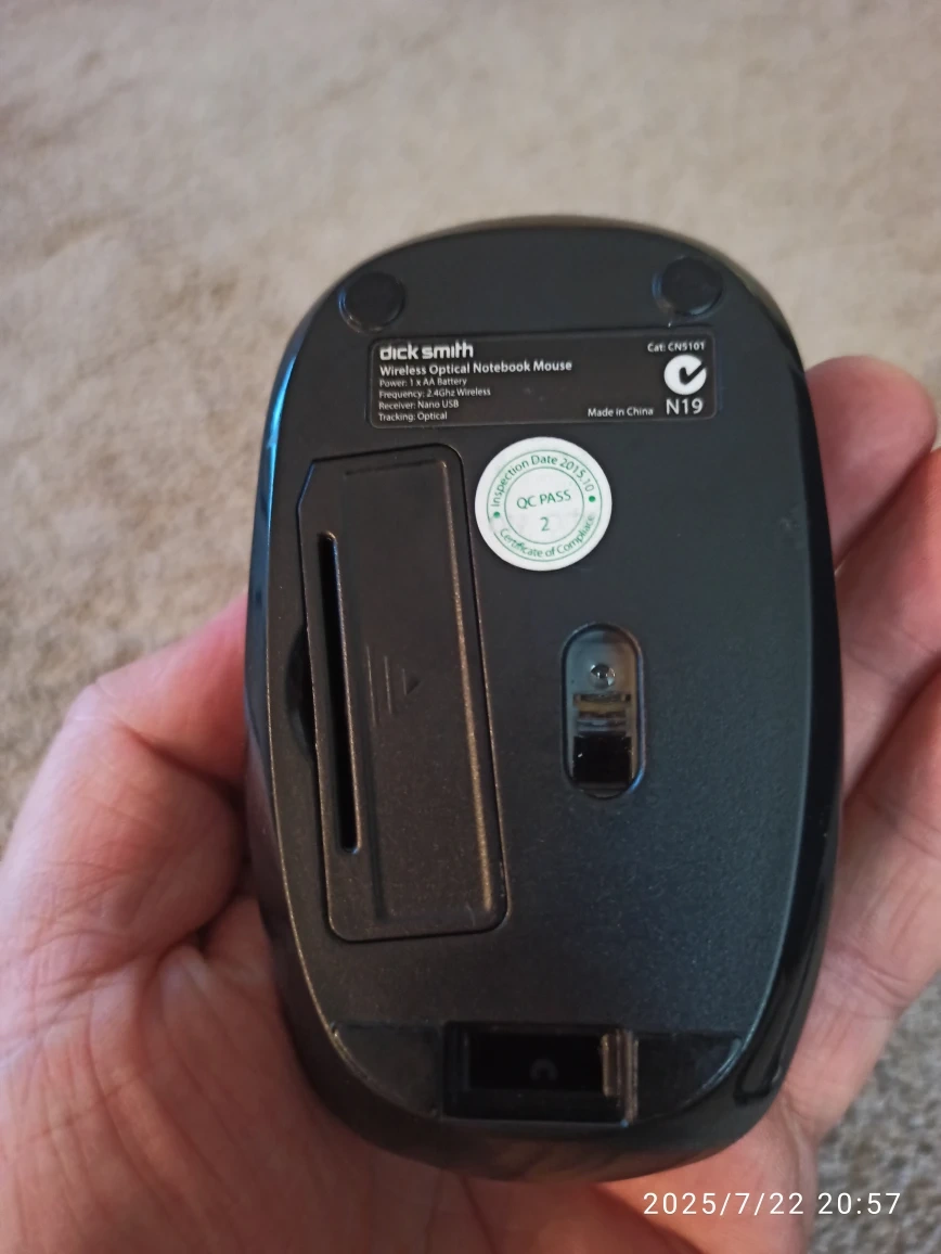 give away for parts a Dick Smith Wireless Optical Notebook Mouse! It's in used condition but still works great. It features Nano USB tracking and is optical. Perfect for everyday use with your laptop or computer