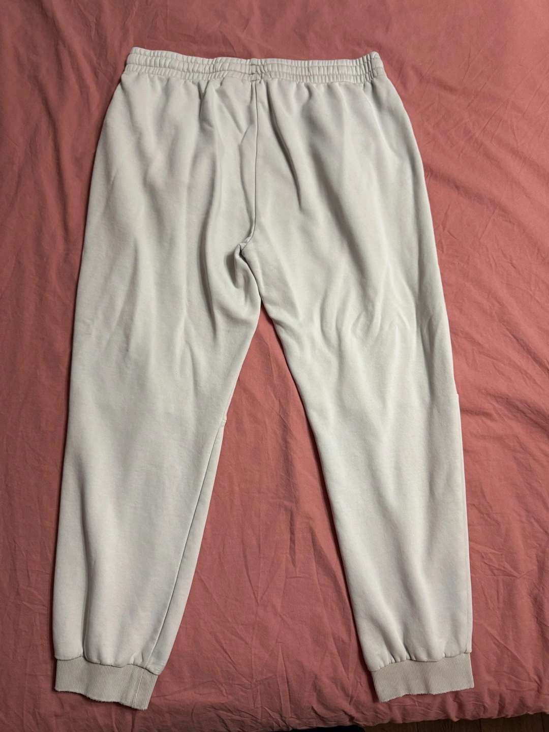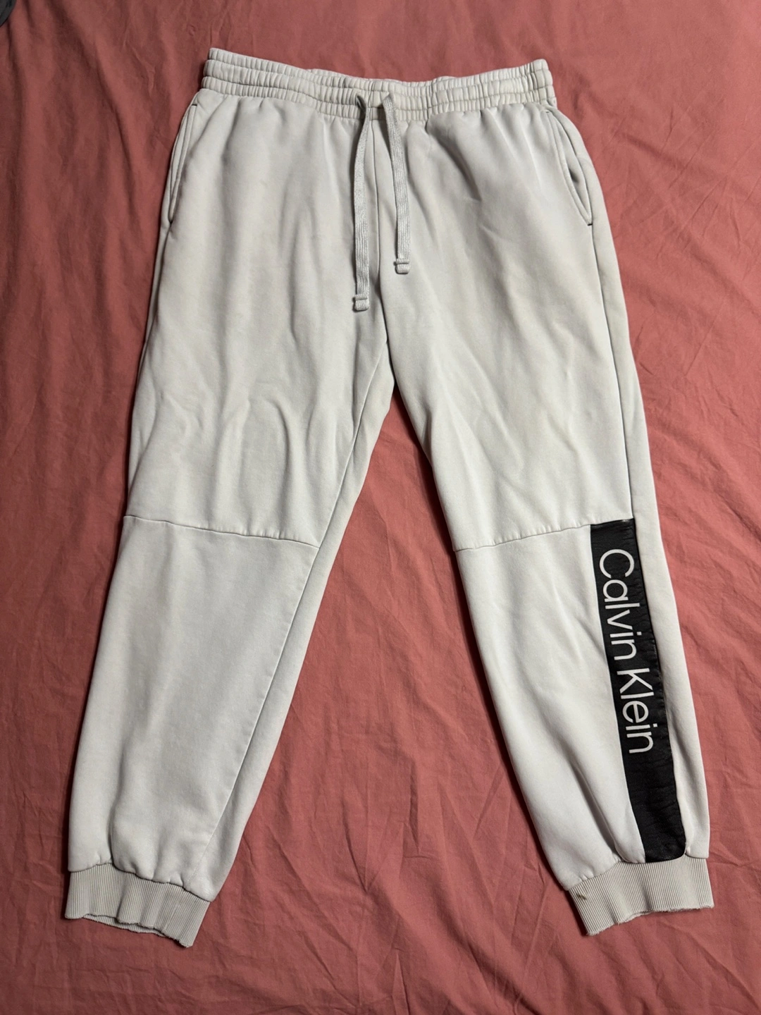 Selling a pair of comfy Calvin Klein joggers in a neutral colour! They're a size large and have the Calvin Klein logo on the side. Perfect for lounging or running errands.