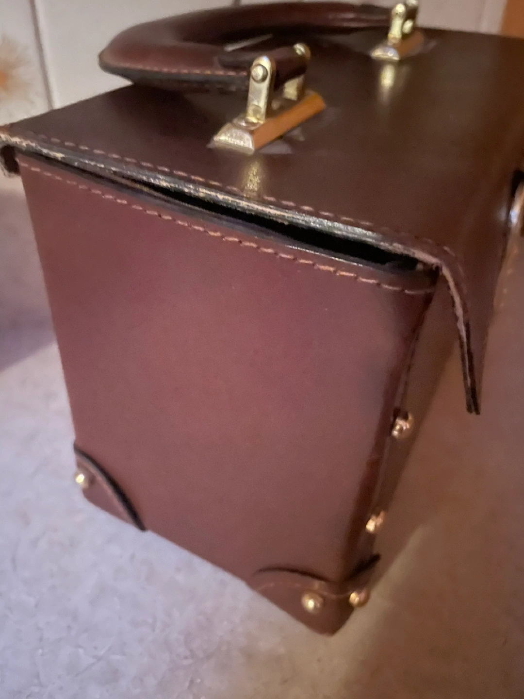 Selling a vintage brown leather train case! It has a handle and a lock. Inside, there's a "Genuine Leather" tag. Great as a purse or for storage