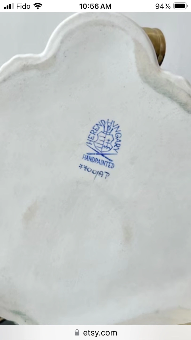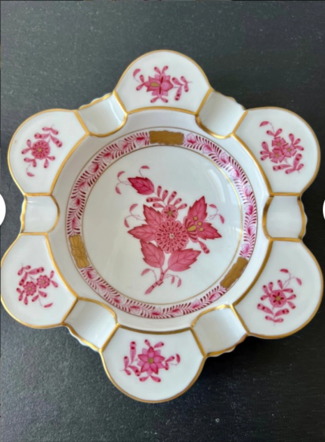 Selling a beautiful Herend Hungary pink aponyi handpainted ashtray. It features a delicate floral design in pink and gold accents on a white background. A lovely piece for any collector!