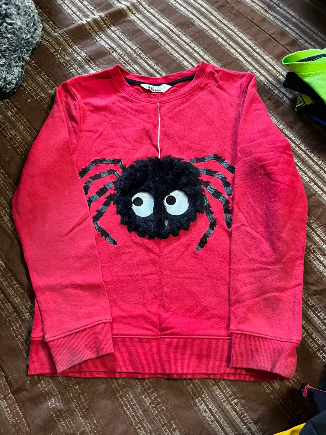 A cute red sweatshirt from H&M, perfect for your little one! It has a fun spider design on the front. Size is 8-10 years.