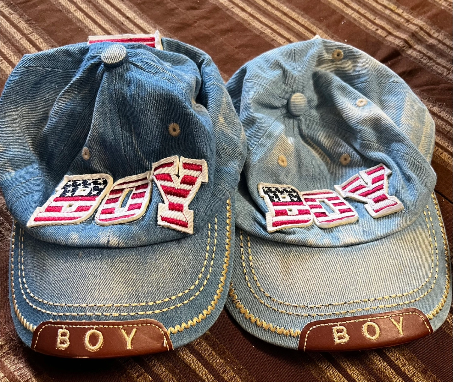 Selling a set of two denim baseball caps with 'BOY' embroidered on the front. They feature American flag patches and a unique denim wash. Great for casual wear!