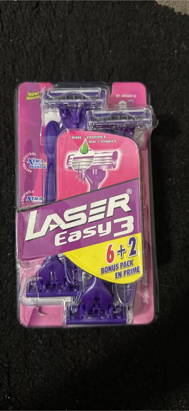 Selling a pack of Laser Easy 3 razors! This is a bonus pack with 6 razors plus 1 extra, for a total of 7 razors. They feature aloe and vitamin E for a smooth shave. Brand new and ready to go!