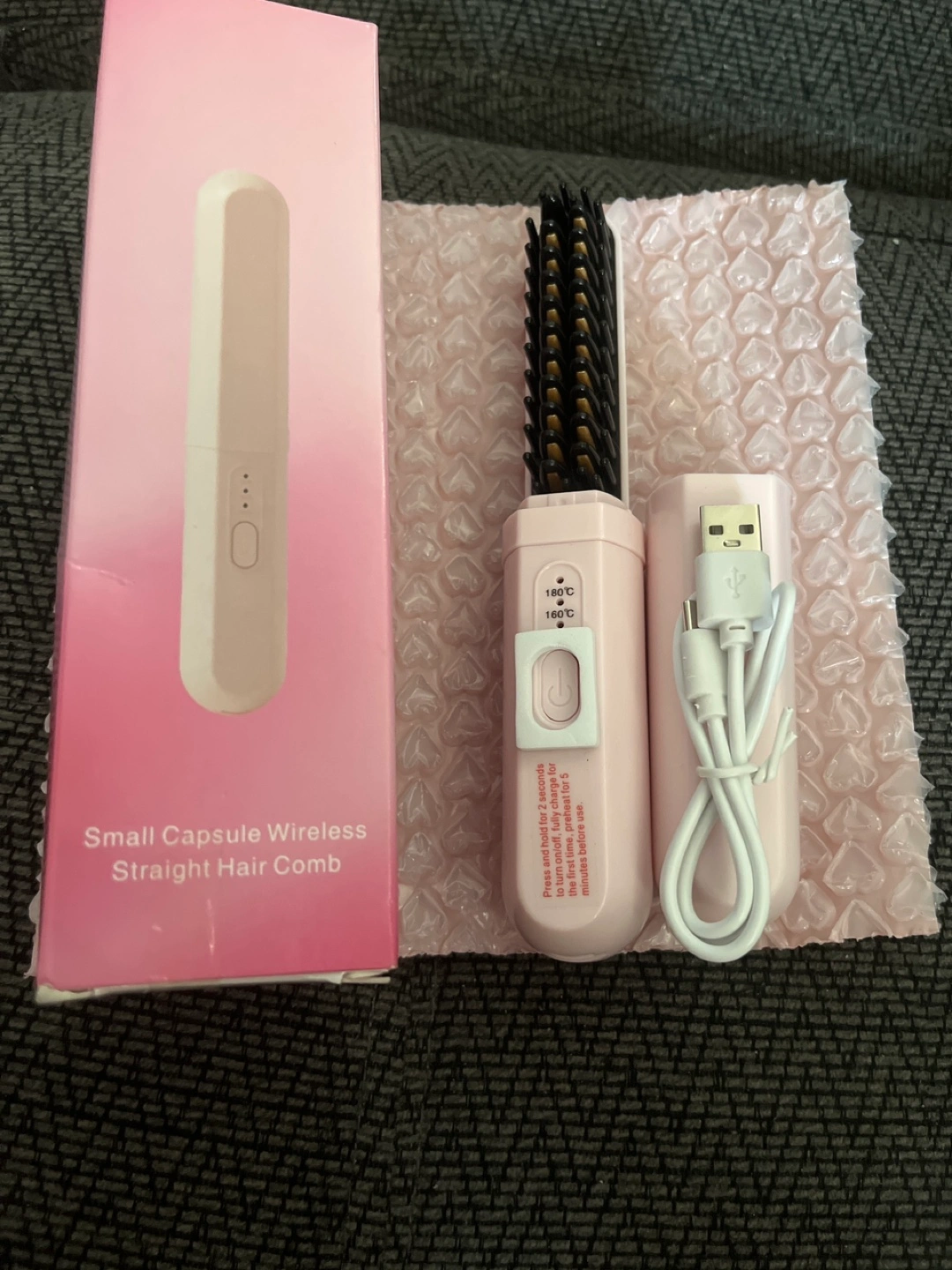 I'm selling a Small Capsule Wireless Straight Hair Comb! It comes with its original box and a charger. It's designed to be lightweight and portable, making it easy to use anywhere. Just press and hold for 2 seconds to turn it on or off, and remember to fully charge it and preheat for 5 minutes before the first use and easy travel