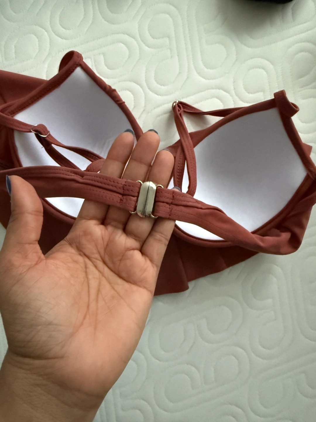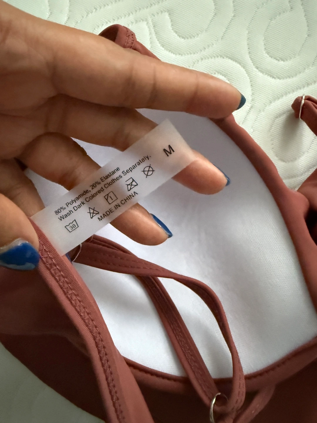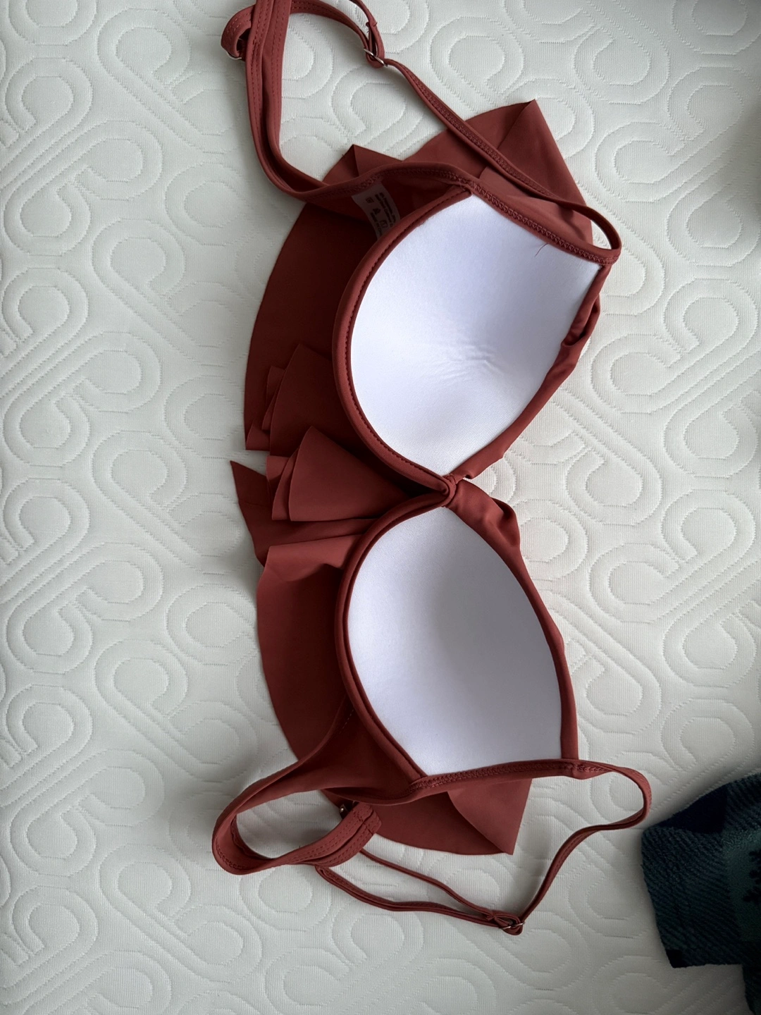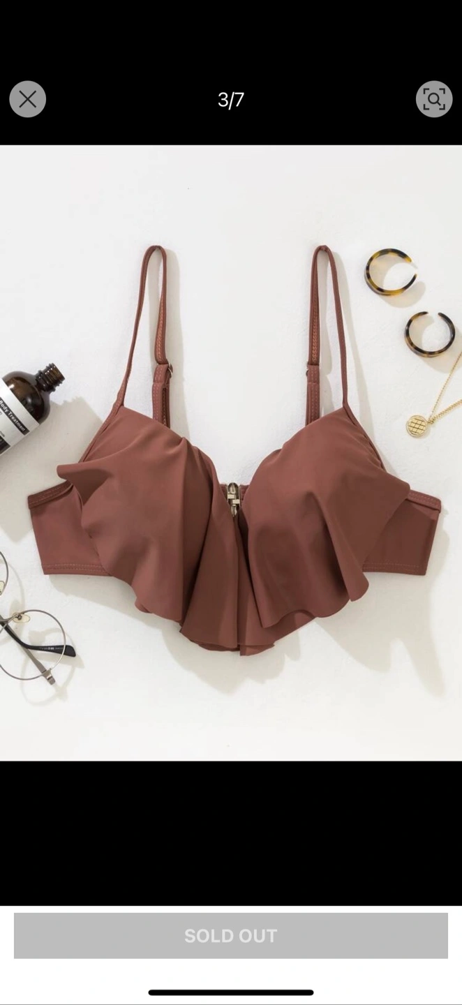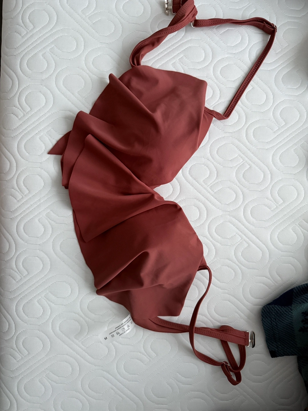 Selling a cute brown ruffle bikini top in size M. The material is 80% polyamide and 20% elastane. Never worn, I received wrong size and am unable to return.