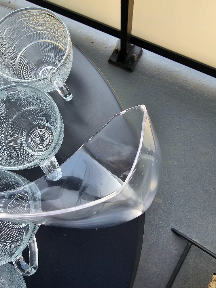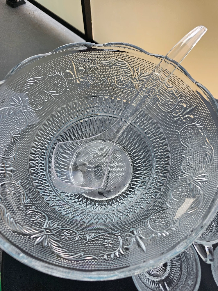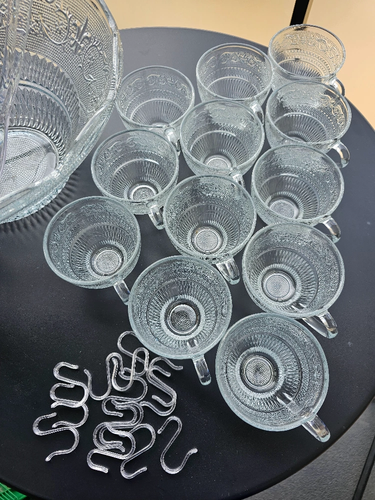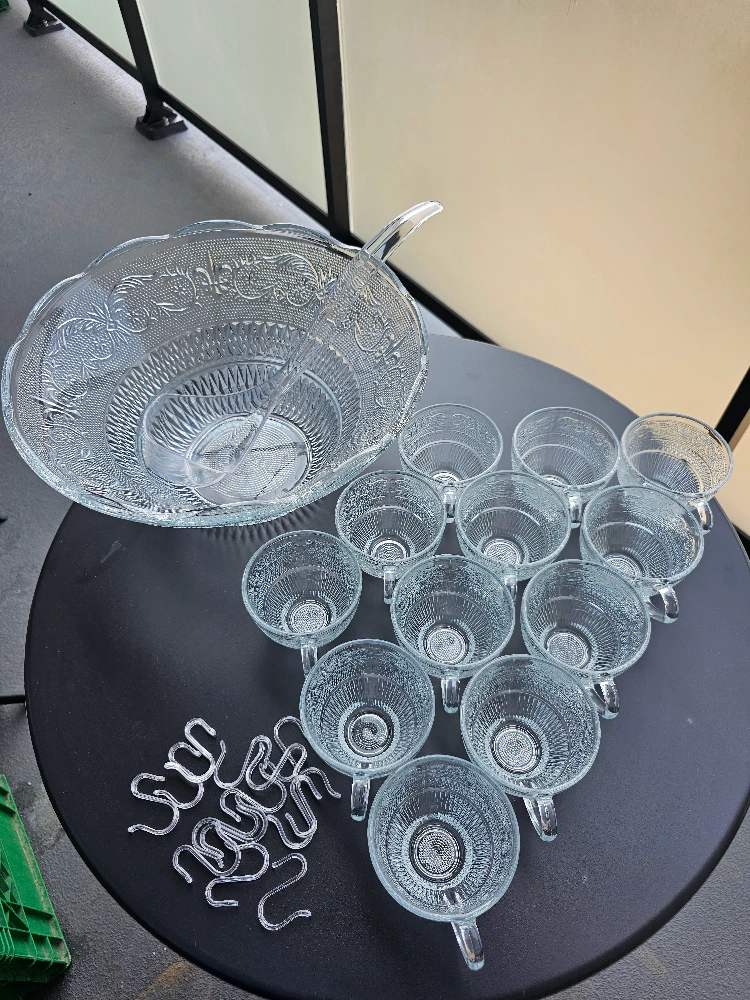DECLUTTERING SALE Includes: 1 Punch Bowl 5.32 QT/5.05 L 12 Cups 7 oz./195 mL 14 Plastic Hooks 1 Plastic Ladle MISSING: 1 Base 1.28 QT/1.22 L Needs cleaning as was in storage Used one time Gifted to my mom by a friend of hers Box thrown out as was in very bad shape FINAL SALE Accepting cash only please