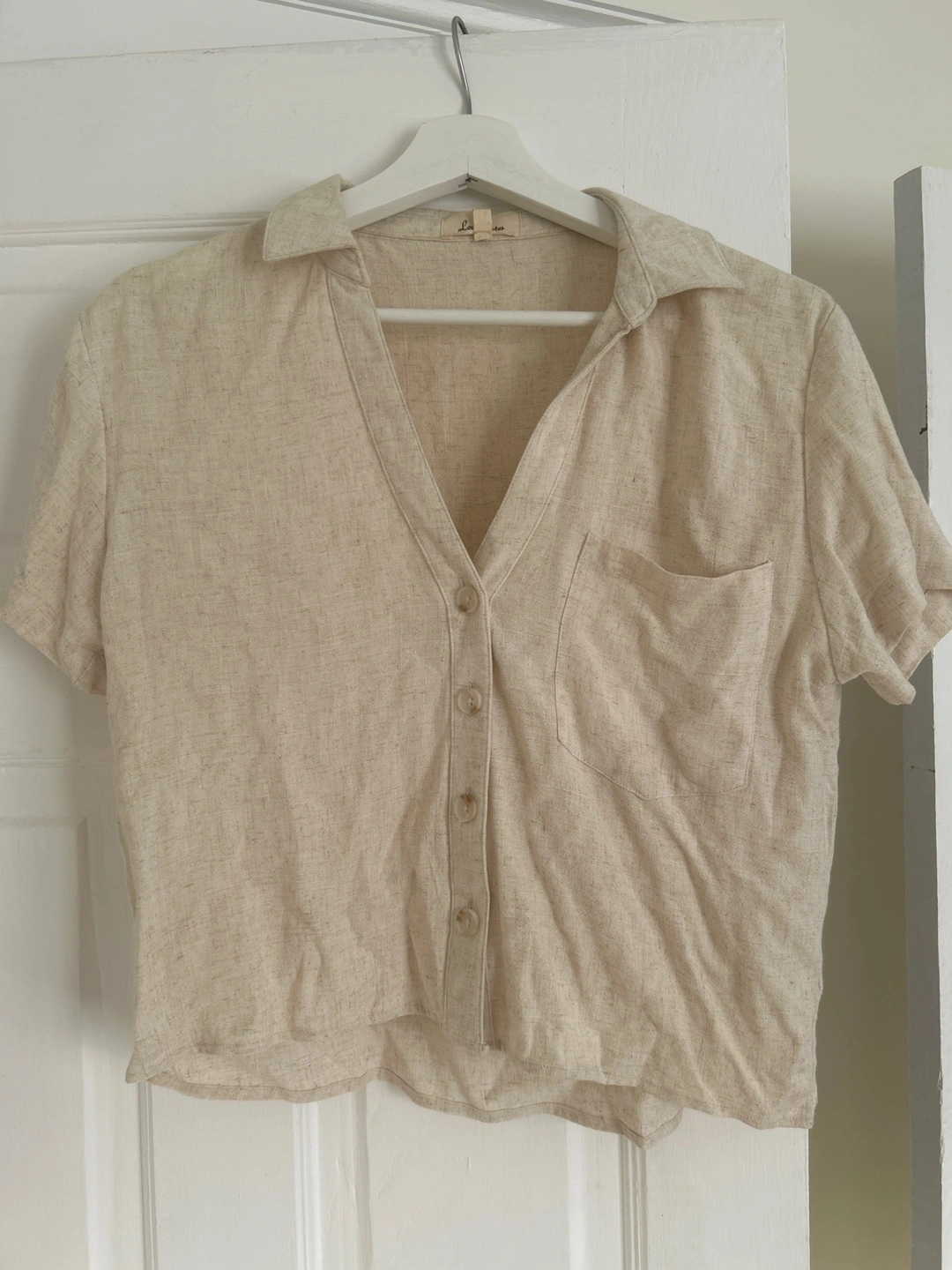 Beige button-up shirt! It's in great condition and ready for a new home! Perfect for summer or fall.