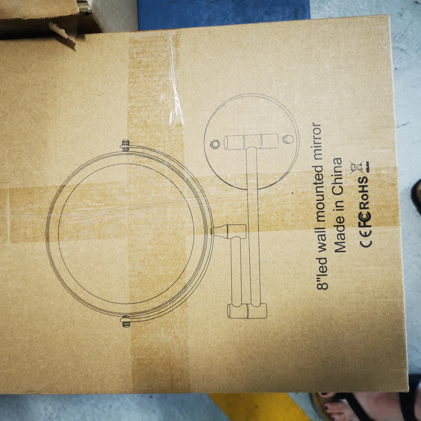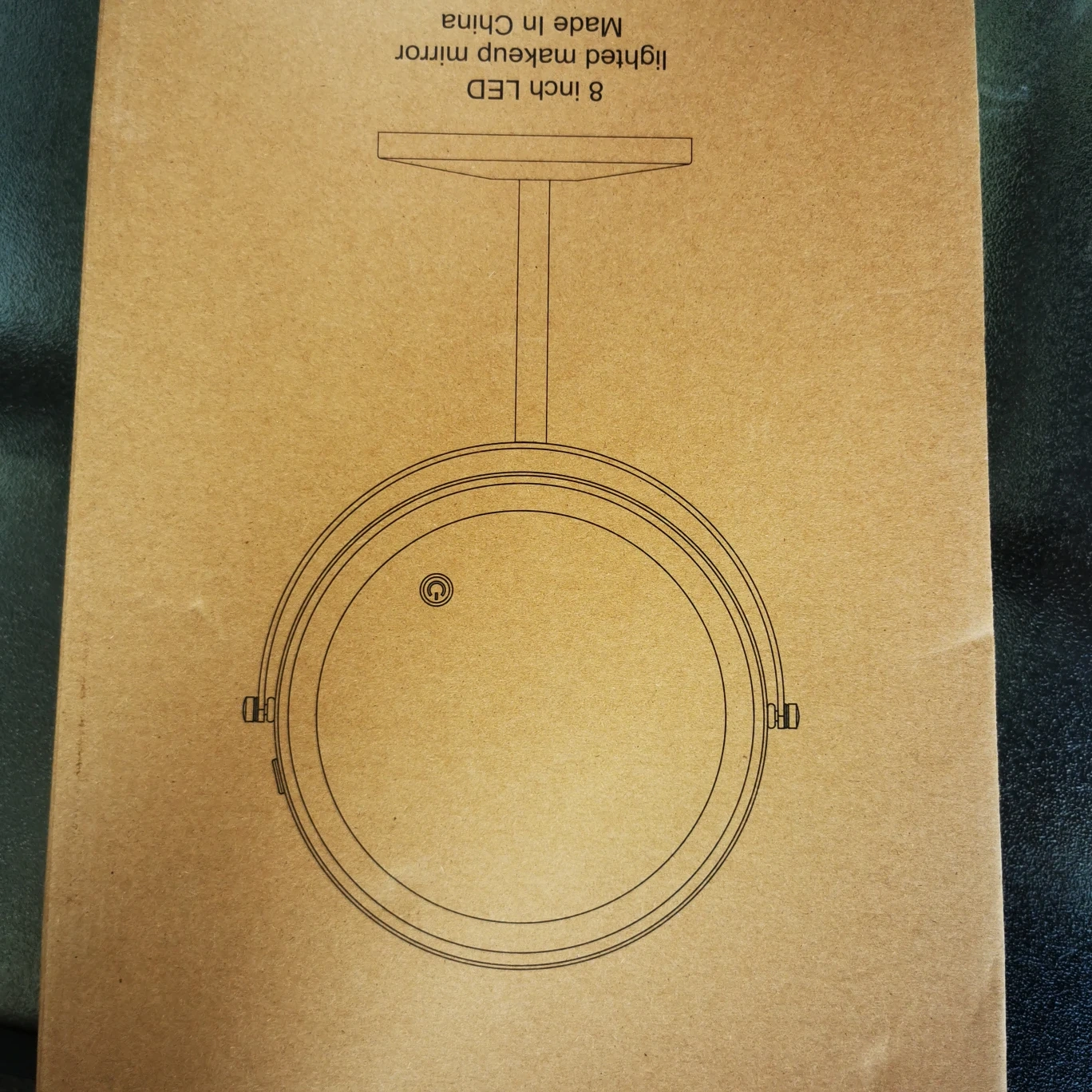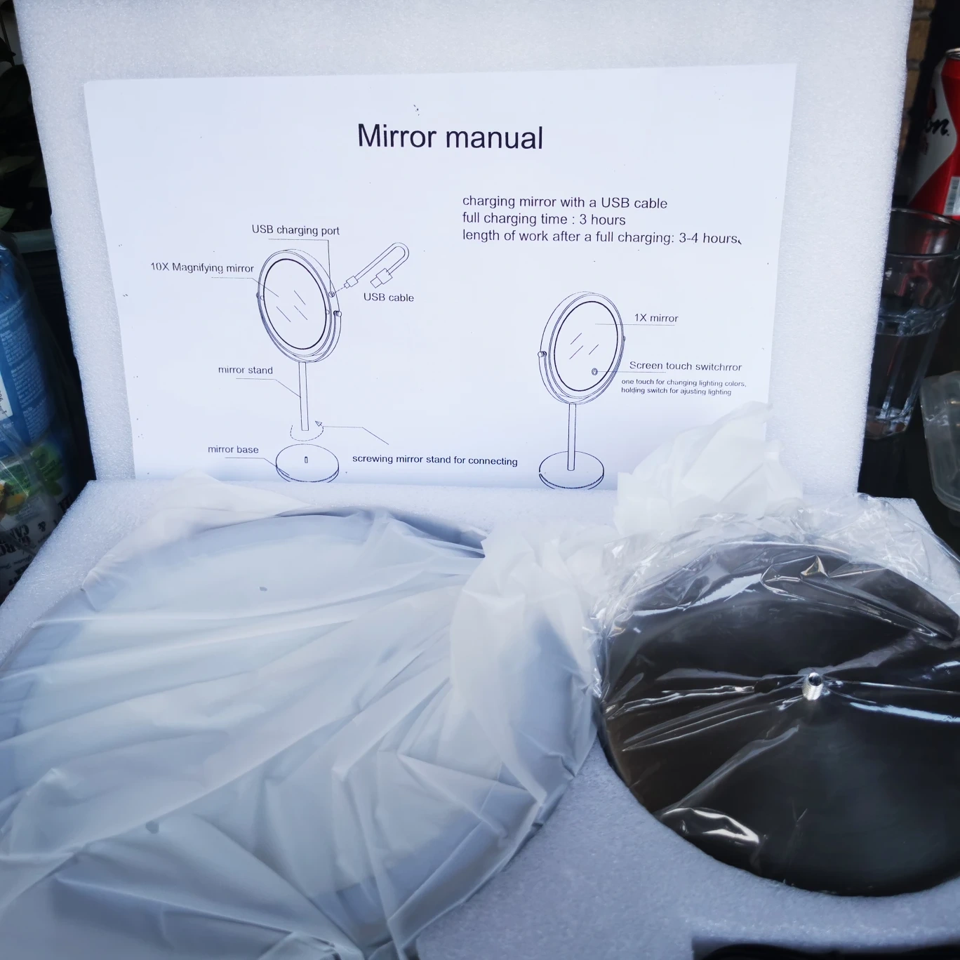 Selling an 8 inch LED lighted makeup mirror. It comes with a USB charging port and cable, as well as a mirror stand and base. The mirror features both a 10X magnifying mirror and a 1X mirror. A screen touch switch controls lighting colours, holding switch for lighting options