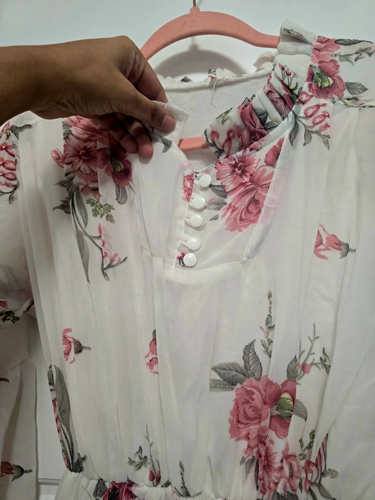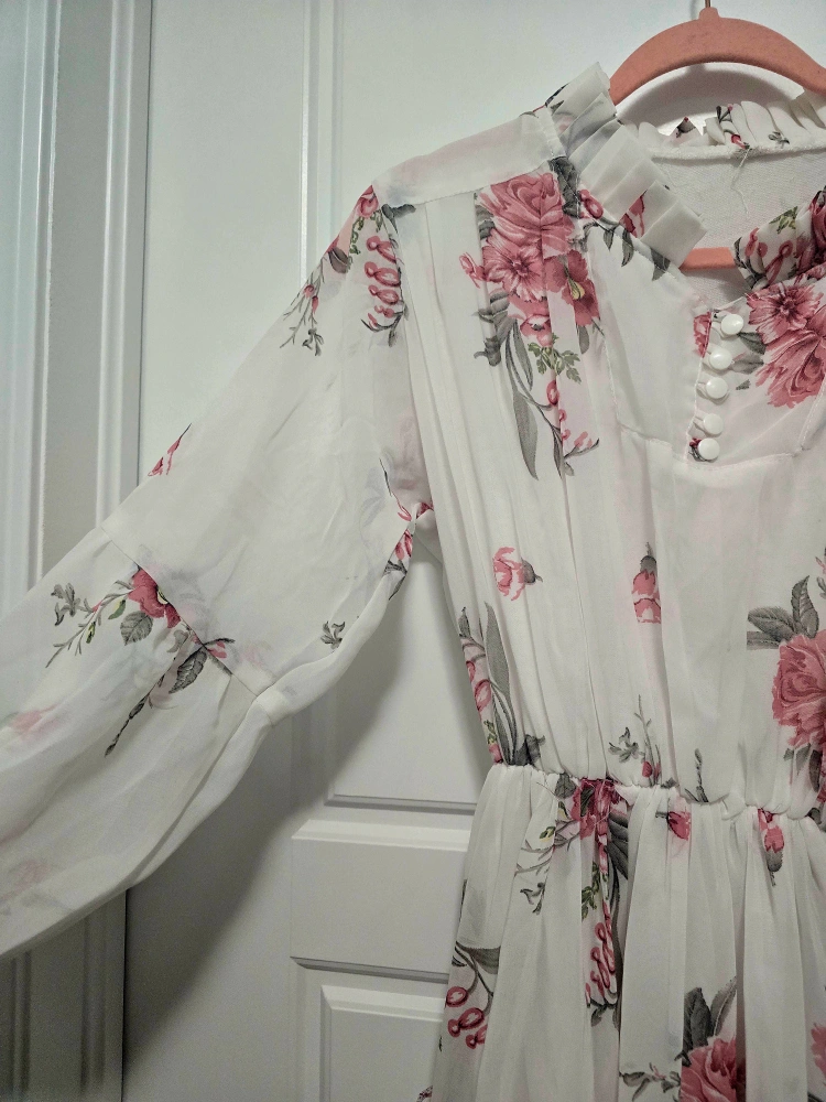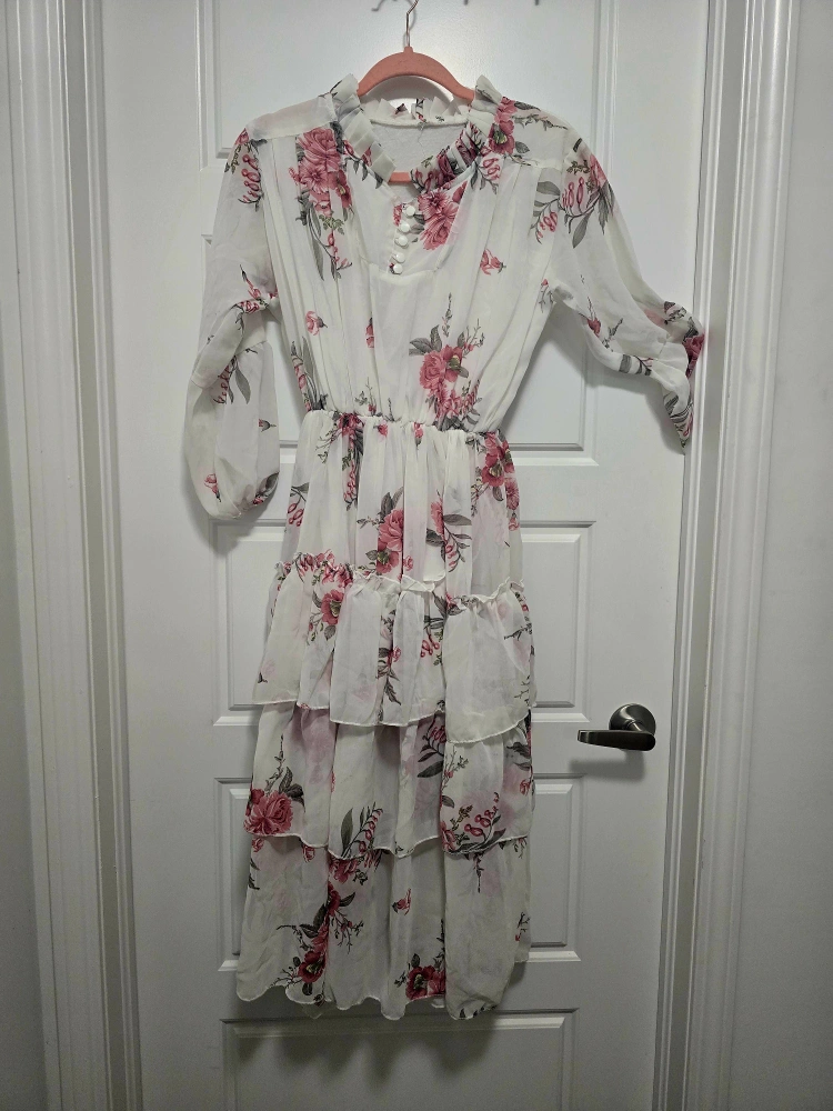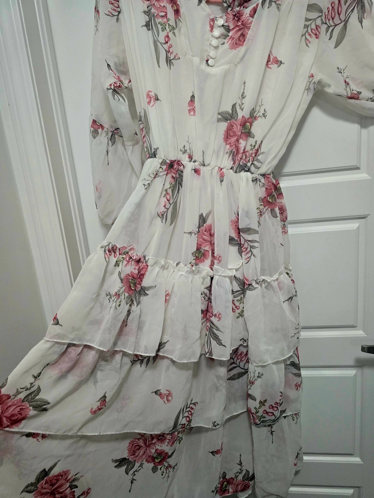 Selling a cute floral print chiffon midi dress. It features a tiered skirt and long sleeves. Perfect for spring or summer!