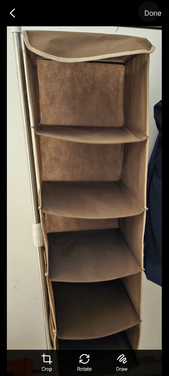 Selling a handy hanging closet organizer! It's a great way to add extra storage to your closet and keep things tidy. The organizer is brown and features 5 shelves for easy organization