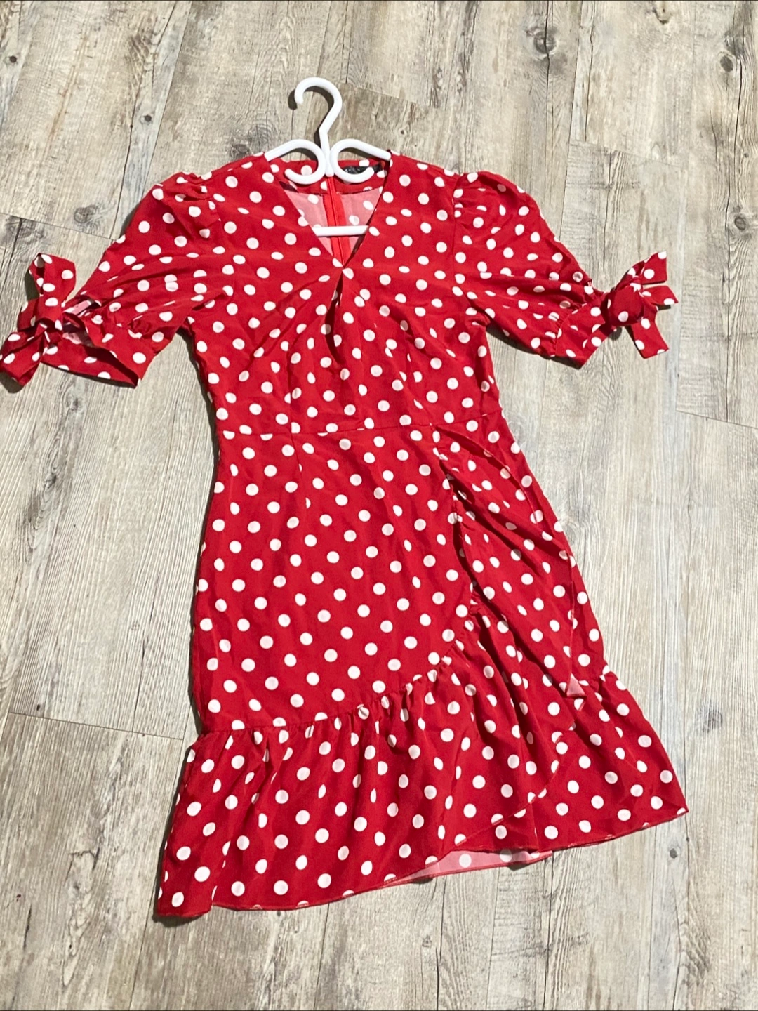 Cute red mini dress with white polka dots! It features a flattering wrap style and sweet tie details on the sleeves. Perfect for summer!