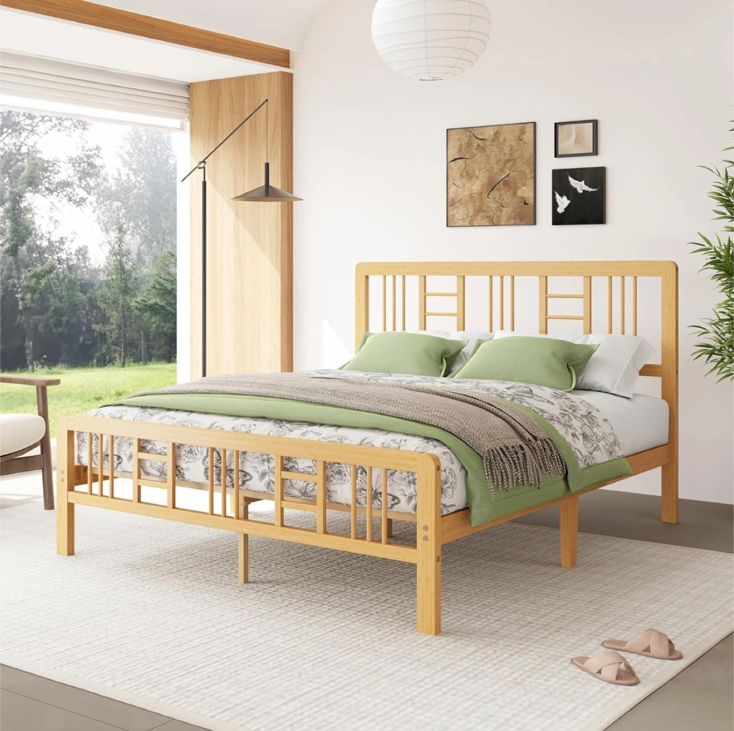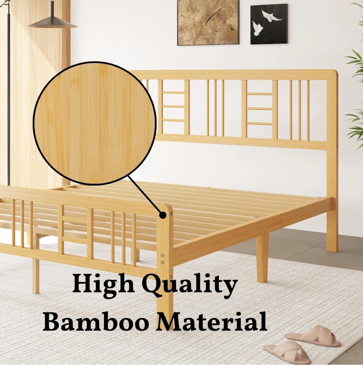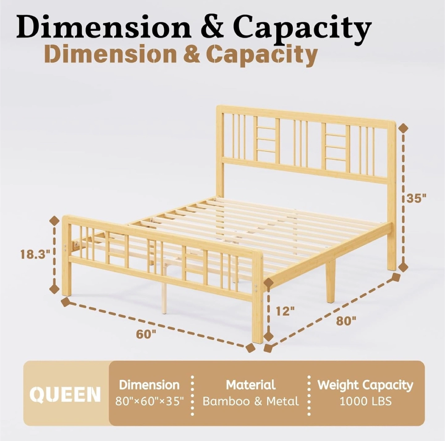 Looking to upgrade your bedroom? I'm selling a queen-size bed frame made from high-quality bamboo and metal. - Dimensions: 80" x 60" x 35" - Weight capacity: 1000 lbs - Provides spacious under-bed storage - Easy to assemble