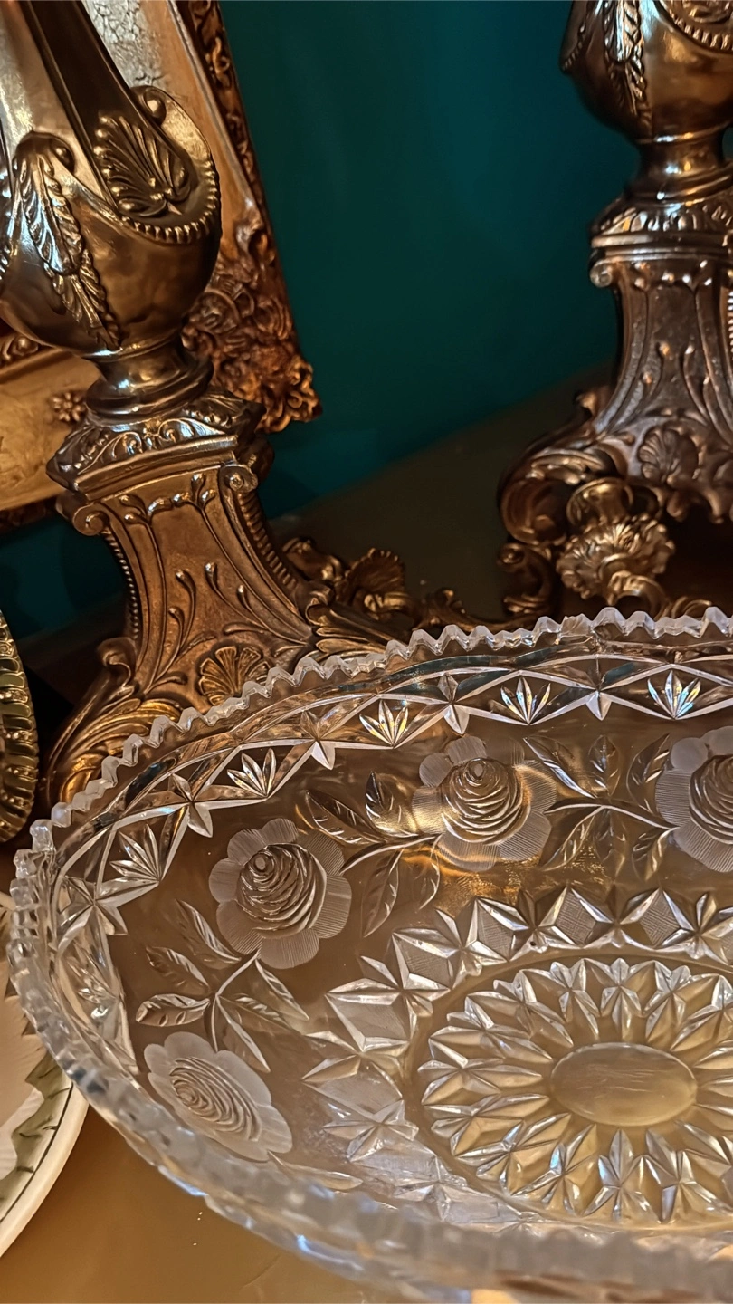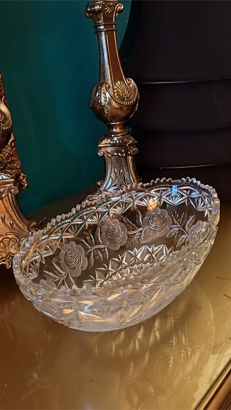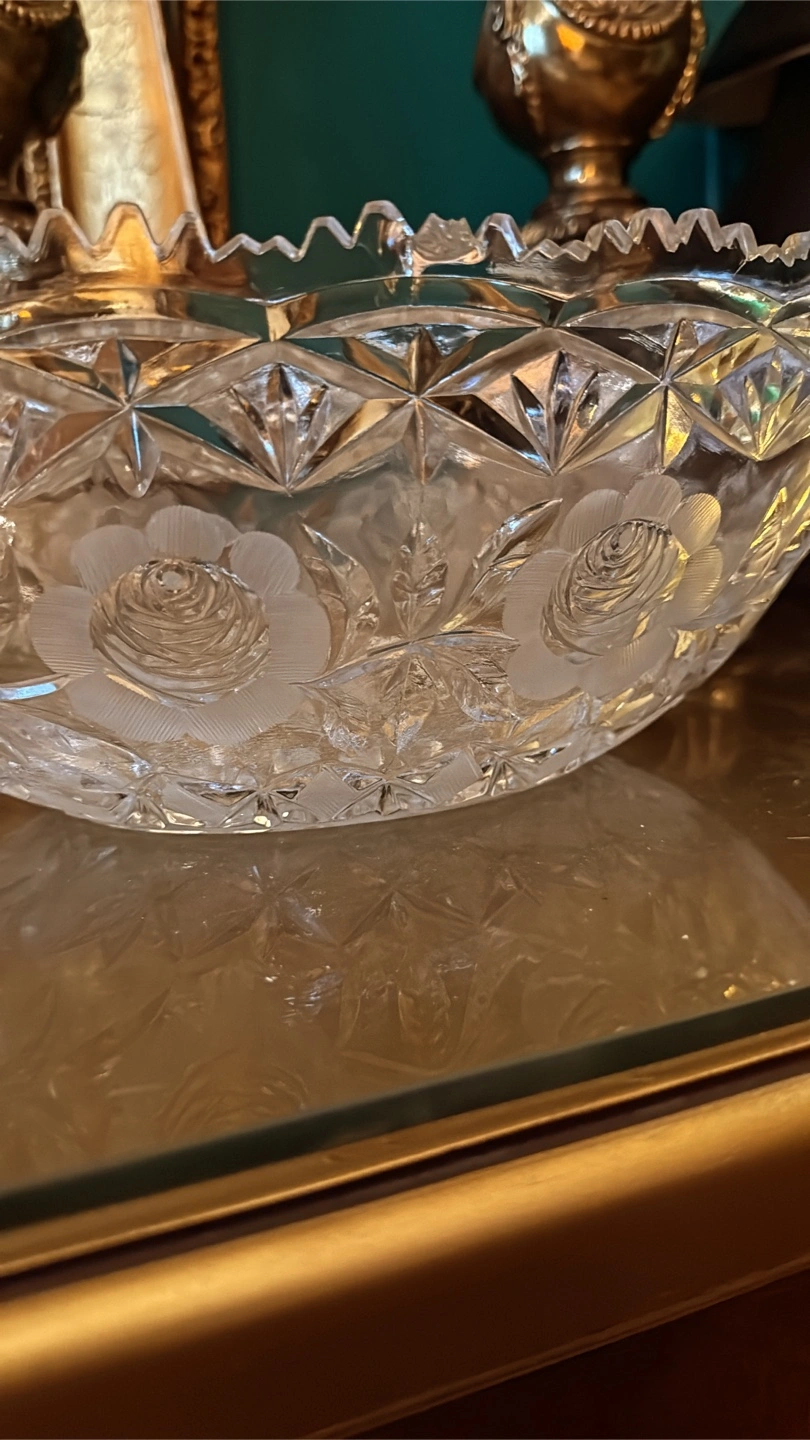 Bring timeless elegance to your home with this pure crystal bowl, beautifully crafted with intricate details and gorgeous rose-flower cuts all around. ✨ Features: • Solid, heavy pure crystal – high-quality and durable • Oval shape with scalloped edges and stunning craftsmanship • Deep cut floral and geometric patterns that catch the light beautifully • Perfect for a centerpiece, fruit bowl, or elegant décor display 💬 This piece is in excellent condition – no chips or cracks. A must-have for crystal collectors or anyone with a taste for refined home décor.