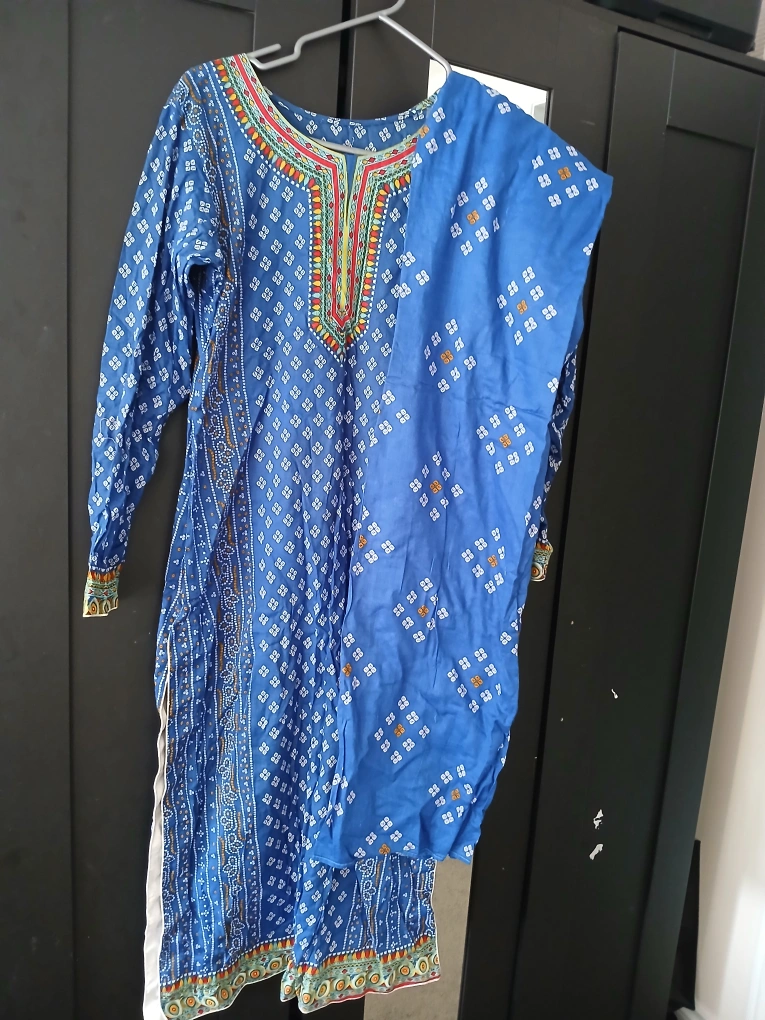 Here's a lovely blue kameez shalwar and dupata suit! It features a bright blue colour with a unique print. Perfect for a special occasion or just to add some colour to your wardrobe