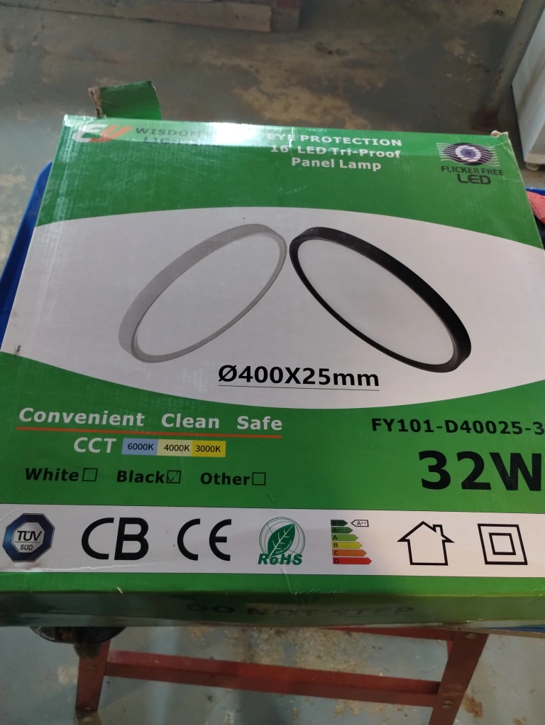 Selling a Wisdom Light 16" LED Tri-Proof Panel Lamp. It features eye protection and flicker-free LED technology. The dimensions are Ø400X25mm, and it operates at 32W. It offers convenient, clean, and safe lighting with adjustable CCT options: 6000K, 4000K, and 3000K. The box is included!