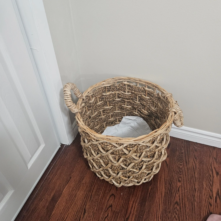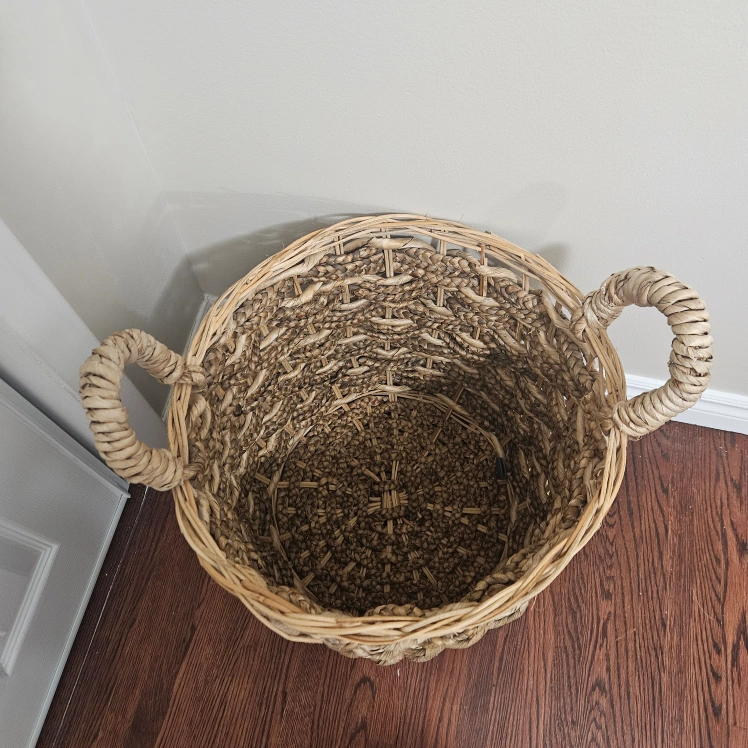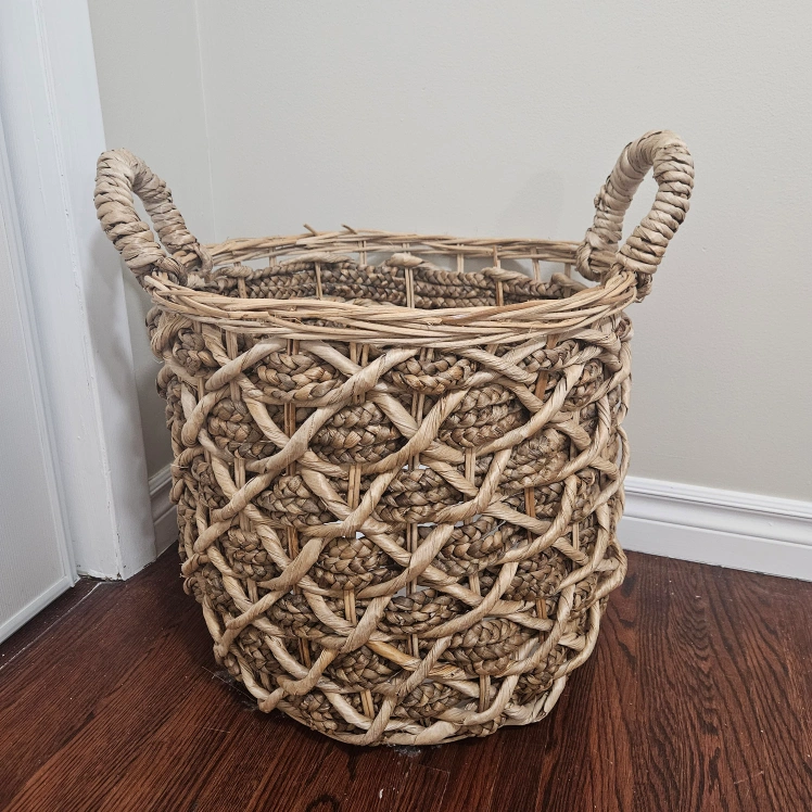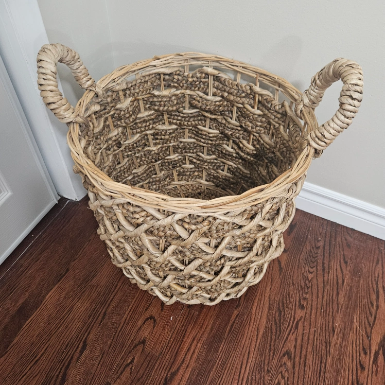 Selling a woven basket with handles. It's in great shape and perfect for storage or decor. The basket has a natural, earthy tone and a sturdy construction