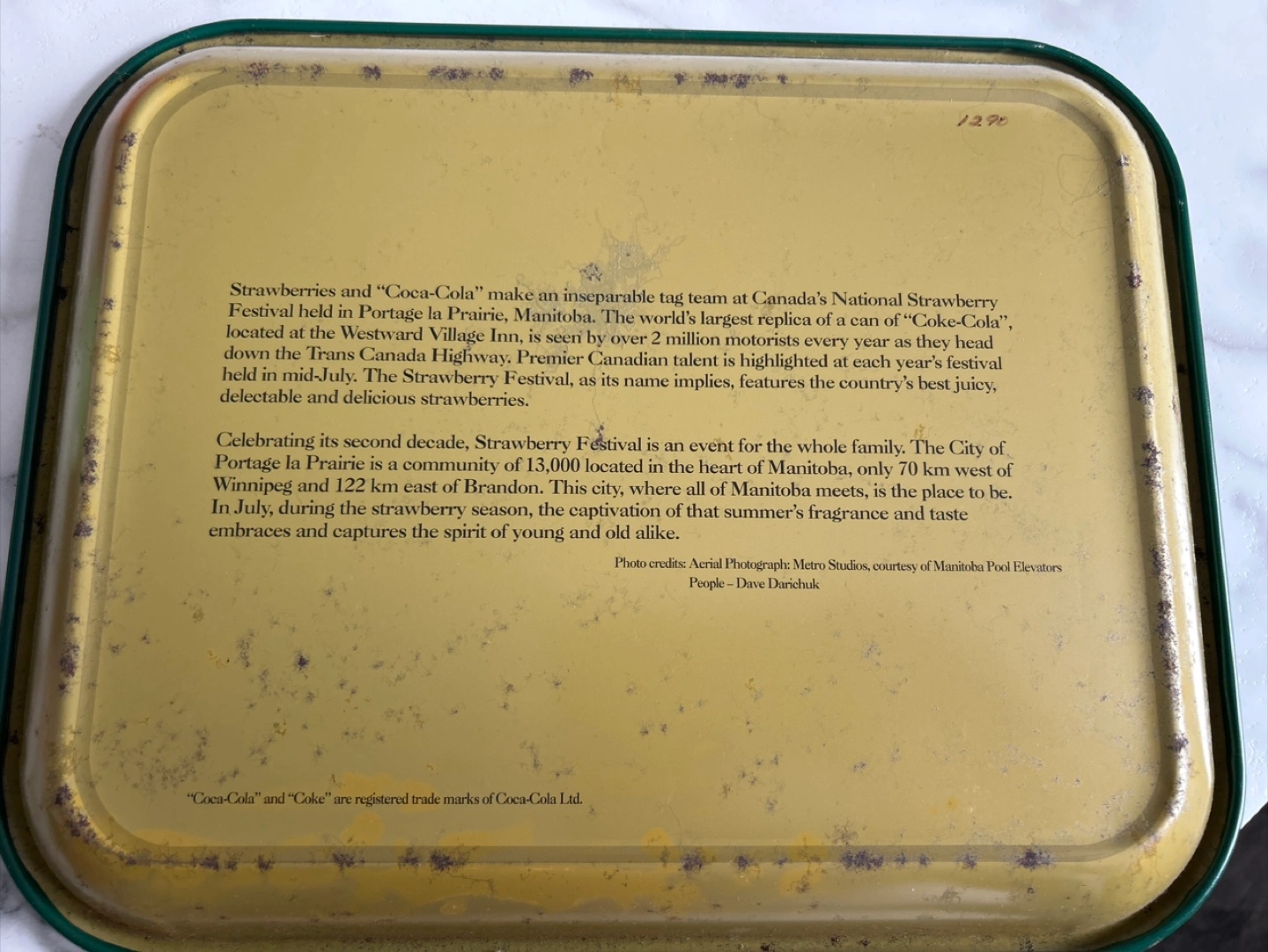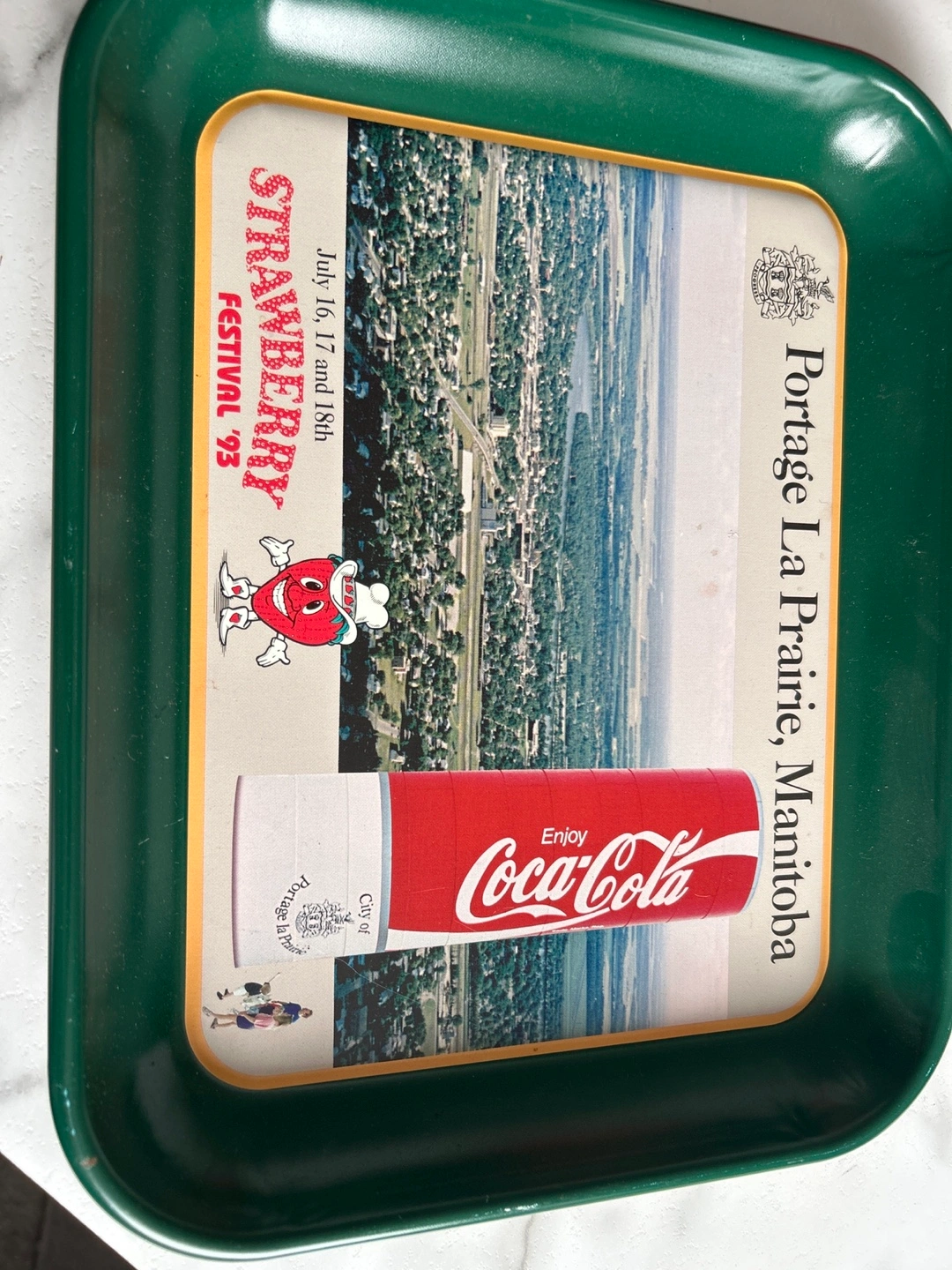 Selling a vintage Coca-Cola Strawberry Festival '93 tray! It features a unique design commemorating the Strawberry Festival held in Portage la Prairie, Manitoba in 1993. A great piece of Manitoba history! Pick up in Elmwood.
