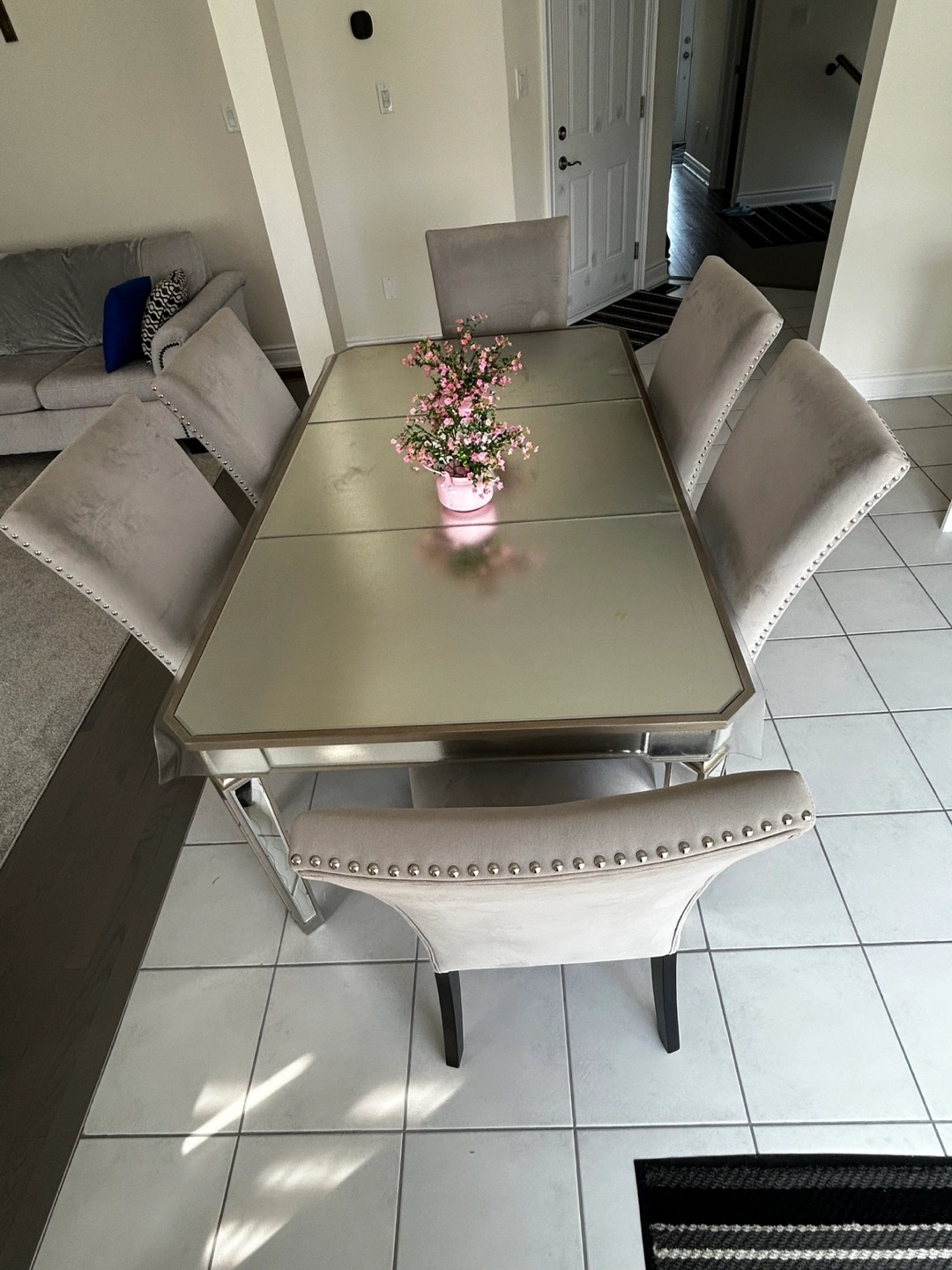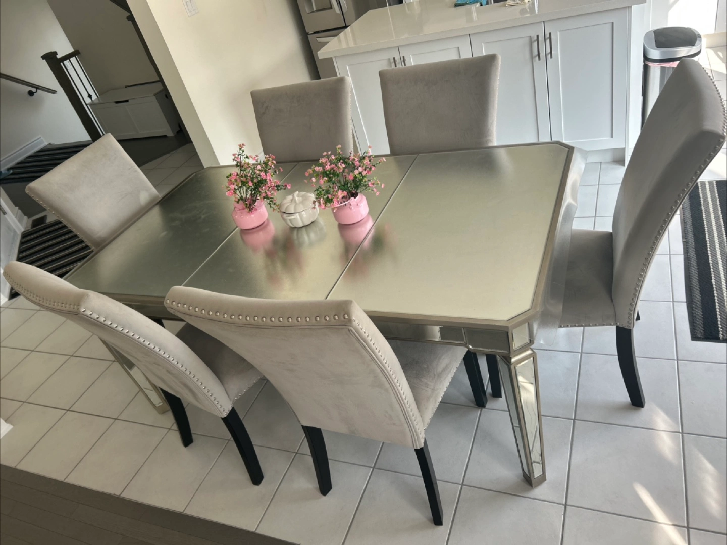 Selling a dining table with six chairs. The chairs are upholstered in a Grey velvet-like material with studded trim. The table has a mirrored finish around the edges and on the legs. It's a stylish set for any dining room!
