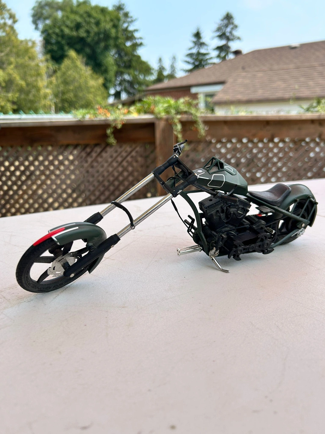 Here's a motorcycle model, perfect for display or as a collectible item. It has a dark green finish with some silver accents. It's in great condition and would look great on a shelf or desk