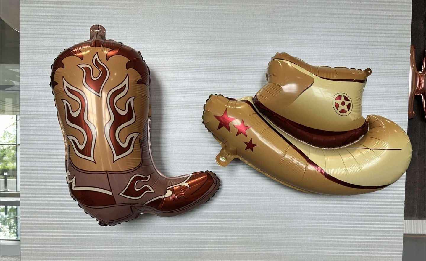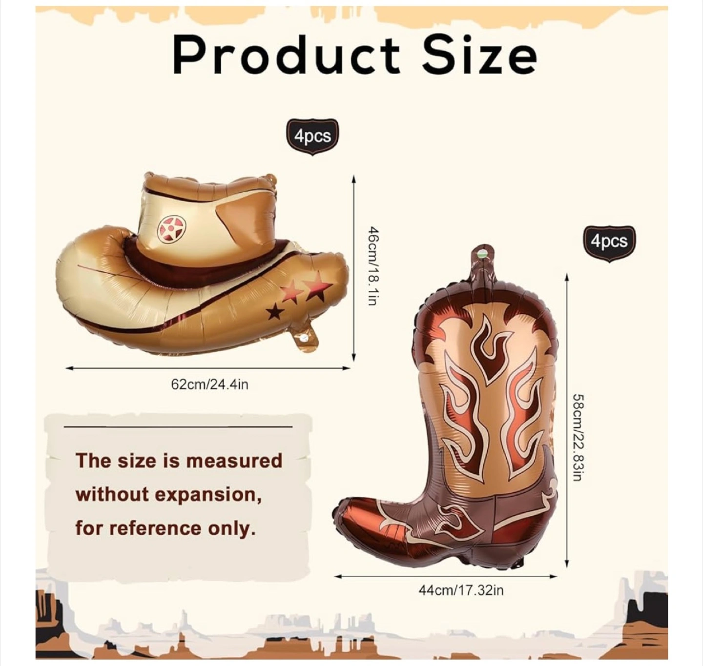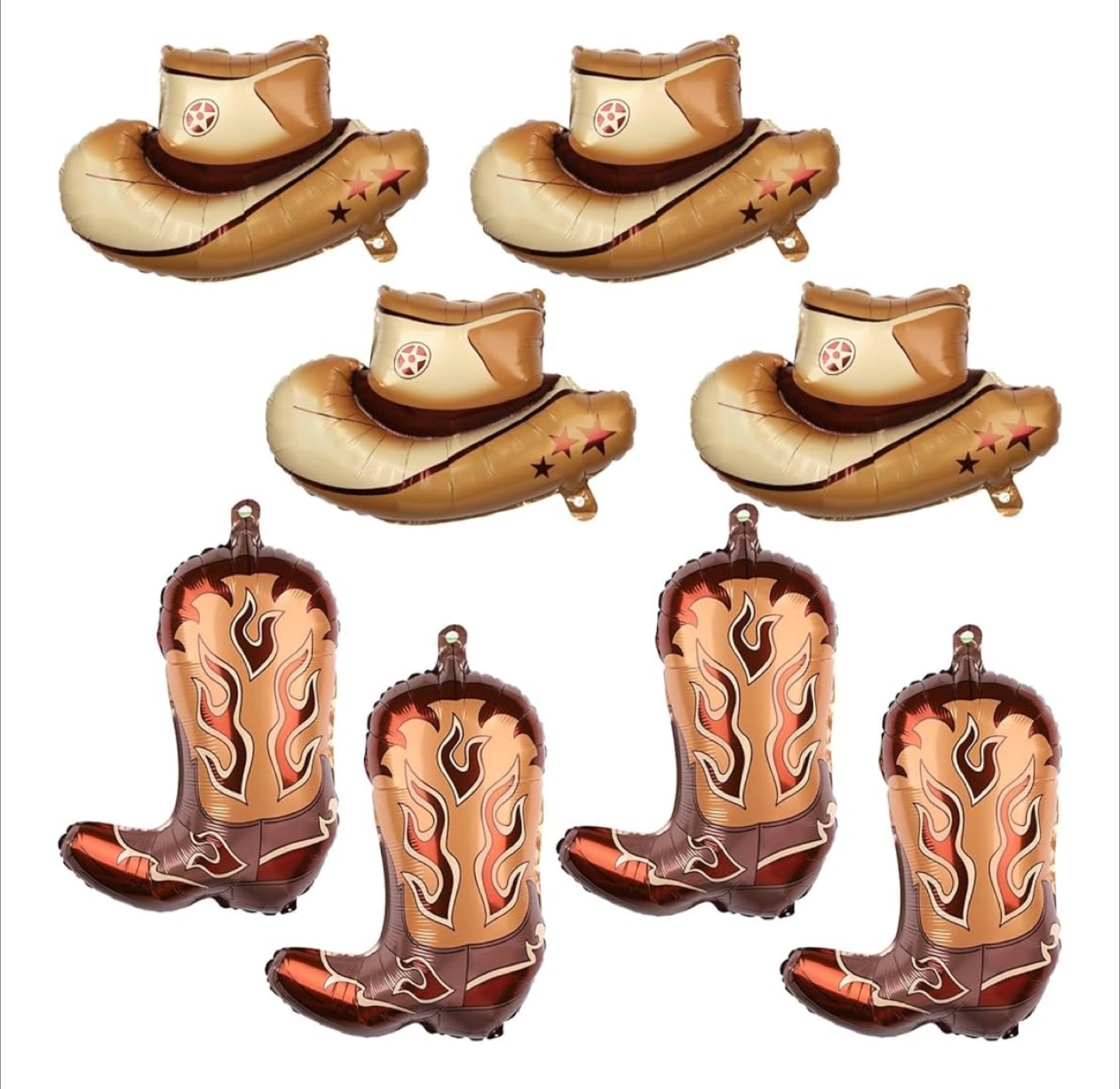 Howdy! I'm selling: - 4 cowboy hat balloons - 4 cowboy boots balloons - 3 round straw table covers perfect for a western party or event. The balloons are already blown up, but you can add air with the straw included. Used for 1 party.