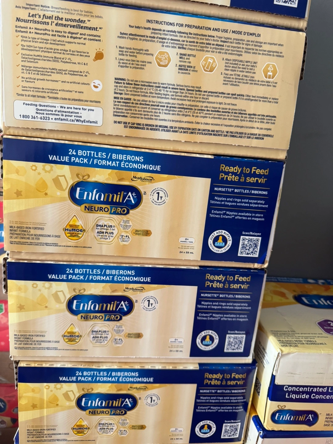 Selling a value pack of Enfamil A+ NeuroPro ready-to-feed bottles! Perfect for newborns, these milk-based iron-fortified infant formula bottles come in a convenient format. They contain DHA plus and HuMO6. Each bottle is 59 mL.