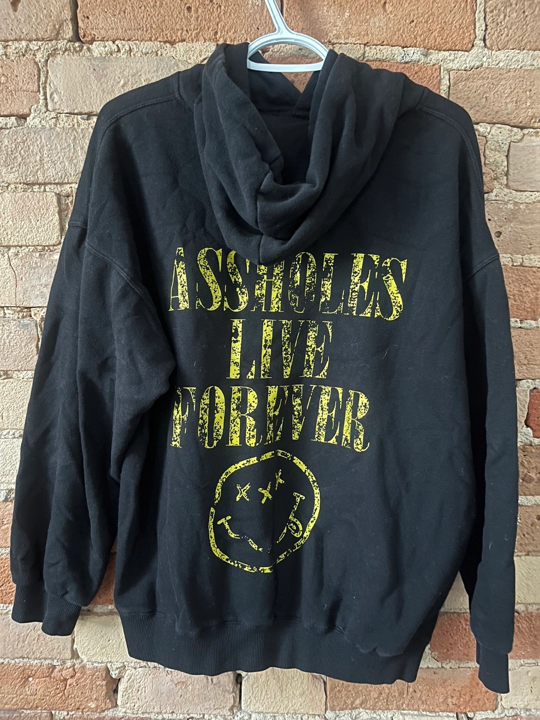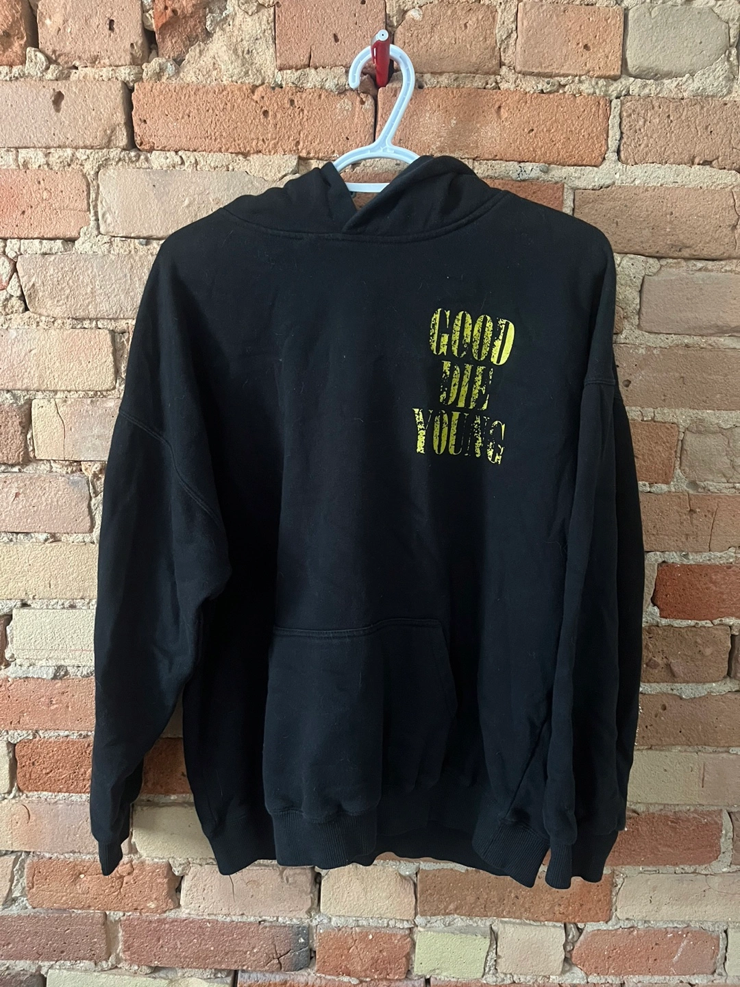 black hoodie with "Good Die Young" printed on the front. The back says "Assholes Live Forever" with a smiley face. It's in great condition and ready for a new home!