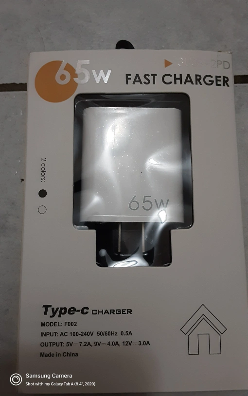 Selling a 65W Fast Charger with a Type-C connection! It's brand new in the box. - Model: F002 - Input: AC 100-240V 50/60Hz 0.5A - Output: 5V 7.2A, 9V 4.0A, 12V 3.0A