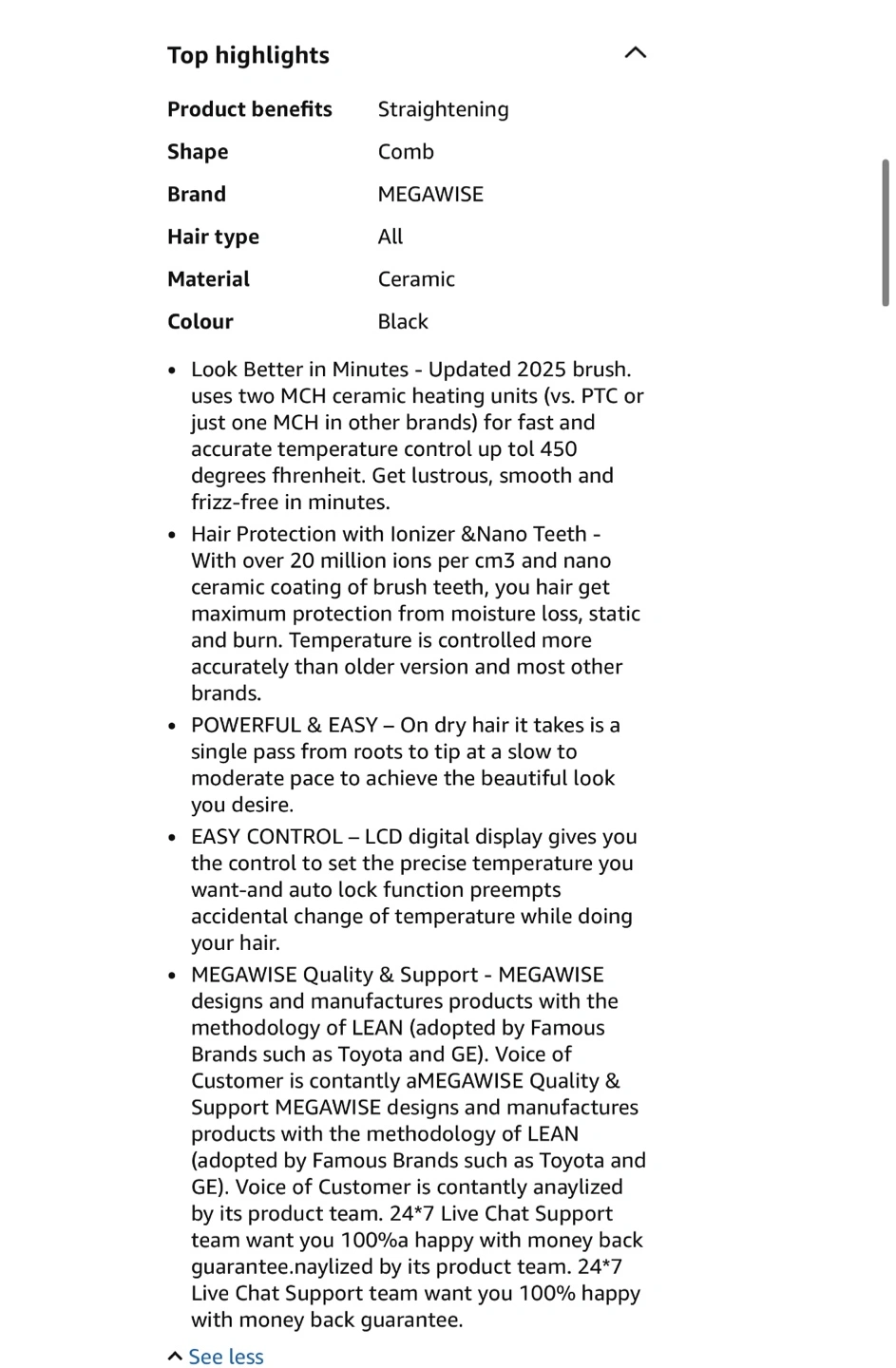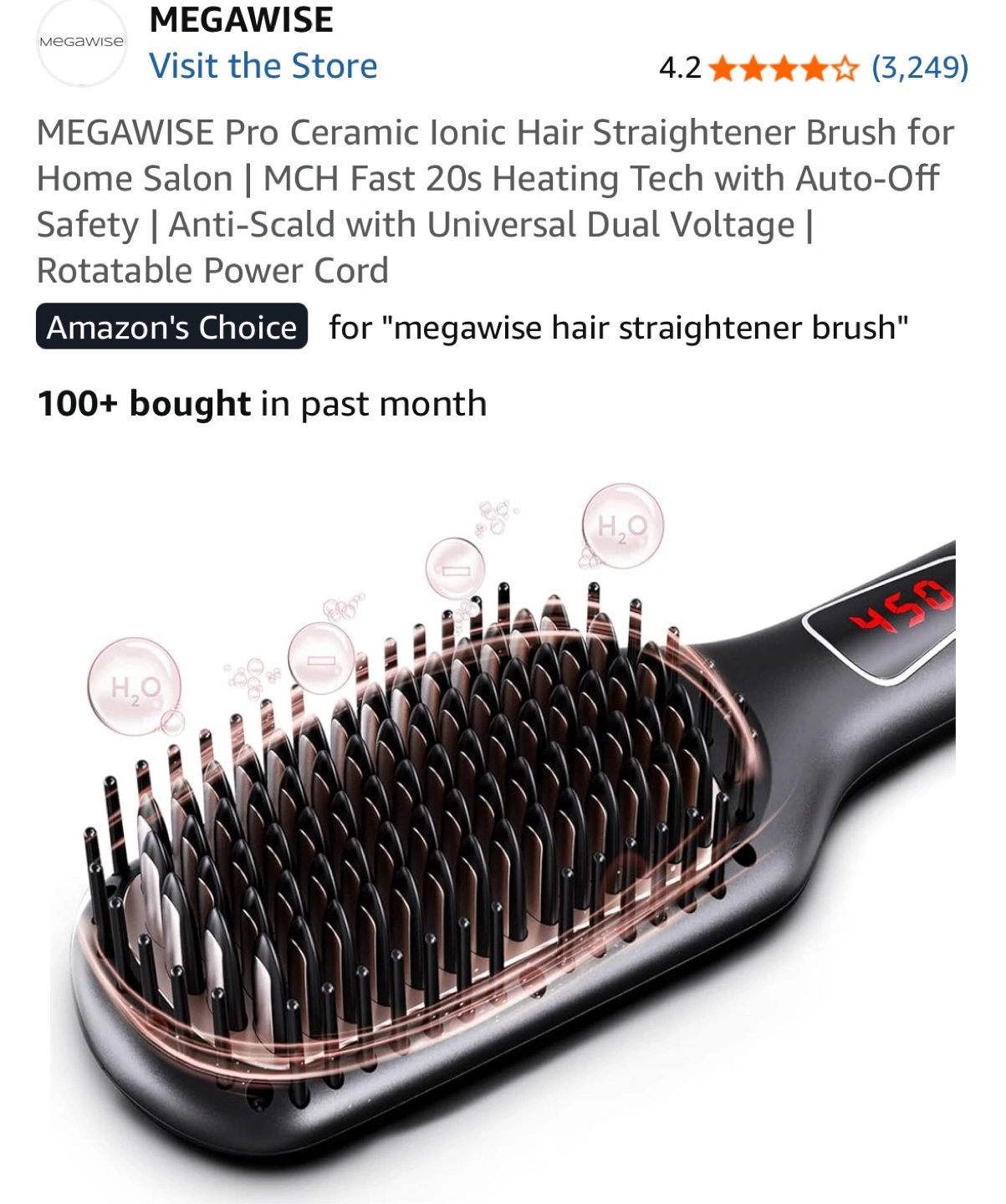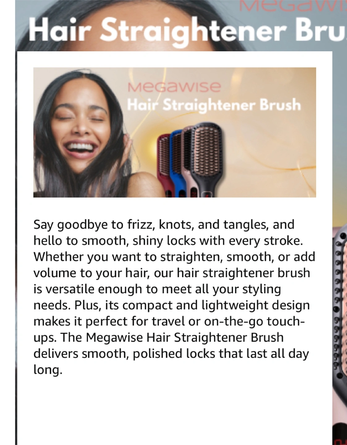 Get ready to say goodbye to frizz, knots, and tangles with the MEGAWISE Pro Ceramic Ionic Hair Straightener Brush! This brush is versatile enough to meet all your styling needs. Its compact and lightweight design makes it perfect for travel or on-the-go touch-ups. Enjoy smooth, polished locks that last all day long! Used once! Not for me!