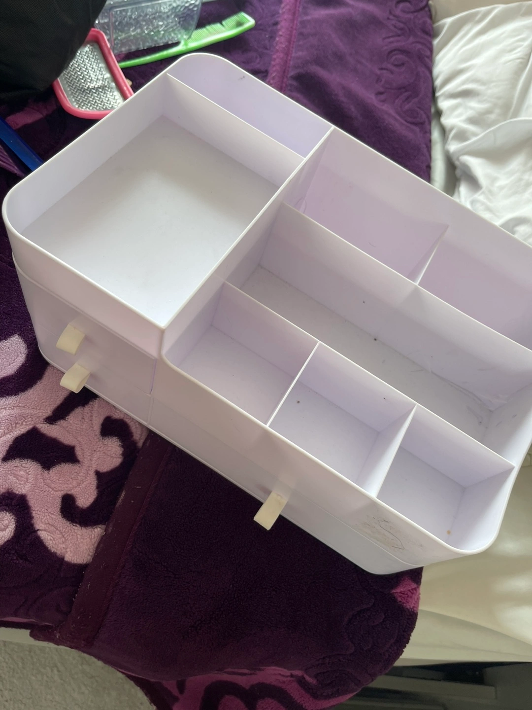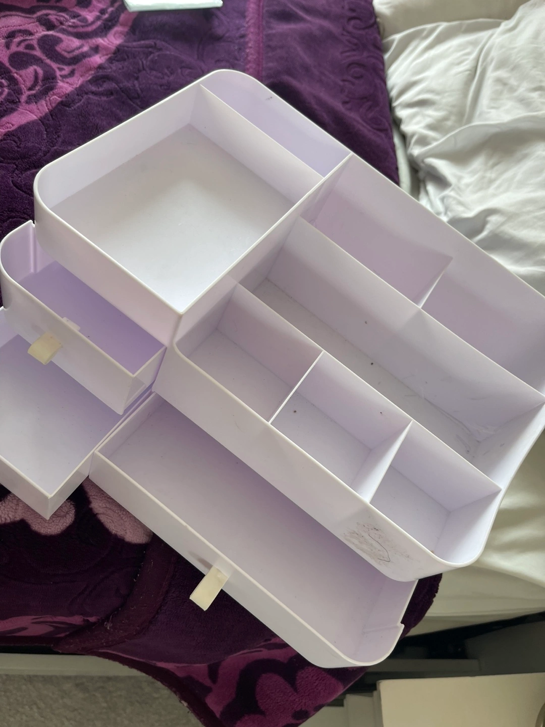 Selling a white plastic makeup organizer. It has multiple compartments and drawers to keep your cosmetics tidy and accessible. It's perfect for keeping your vanity or bathroom counter neat and organized