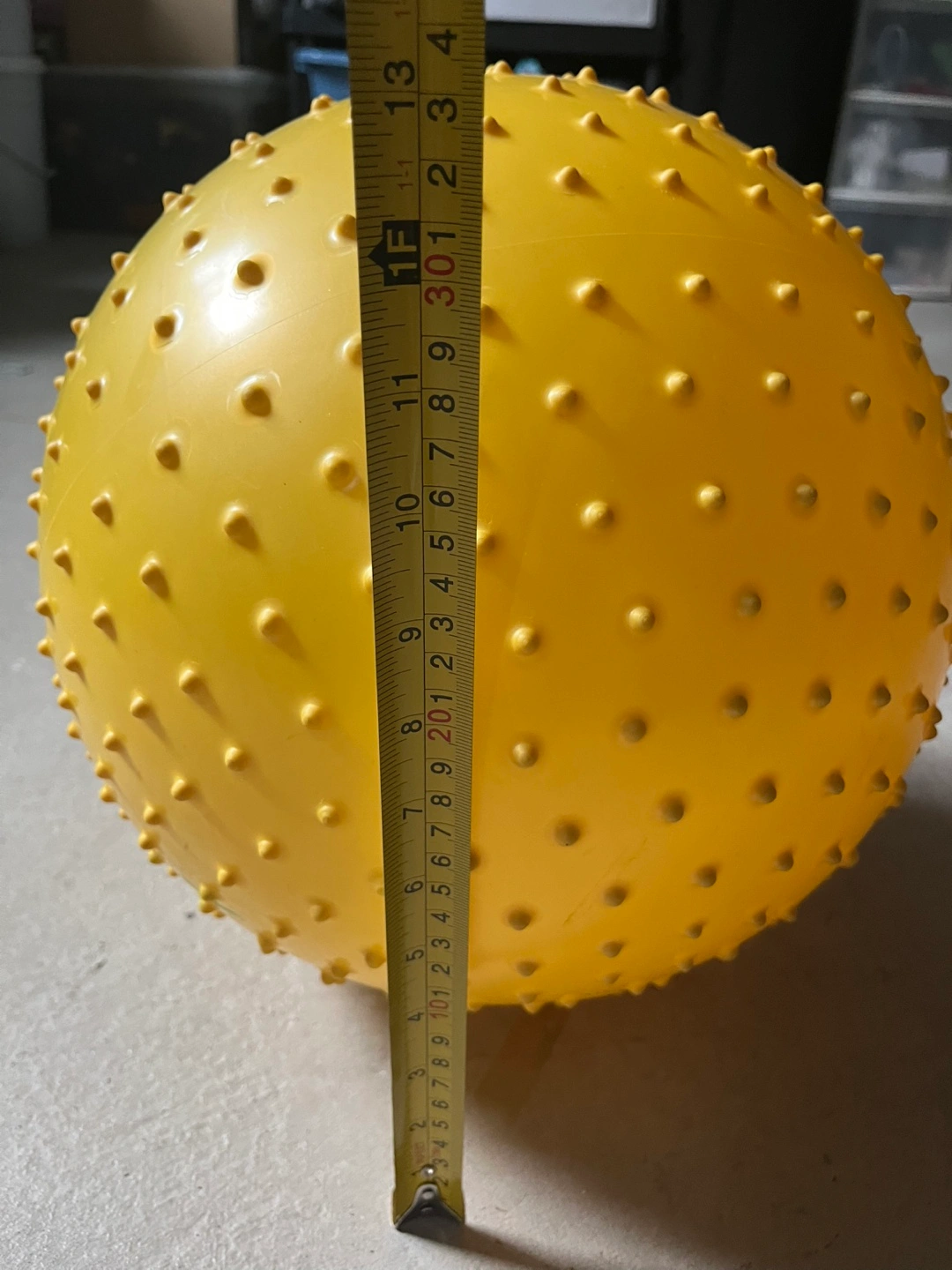 Yellow Spiky Massage Ball. Large inflatable massage ball with soft spikes for sensory play, physical therapy, or muscle massage. Measures approximately 12 in diameter. Great for kids’ activities, balance exercises, or tactile stimulation. In excellent condition. Smoke free and pets free home.
