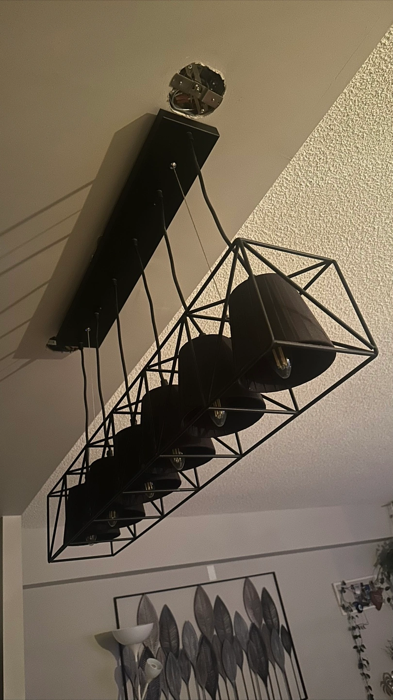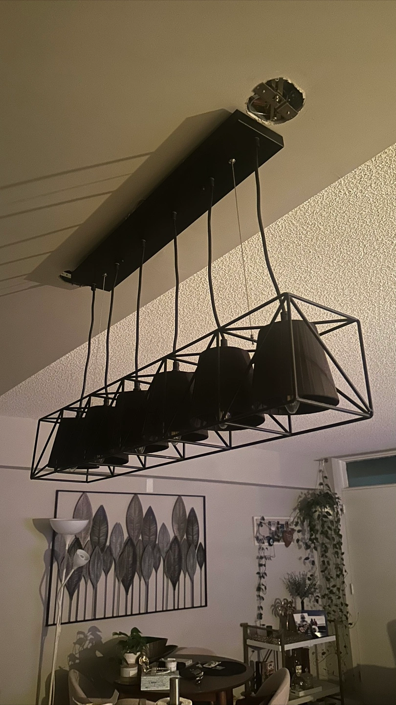 Selling a modern linear island light fixture! It features a black metal frame with six black fabric shades. This stylish light would be a great addition to any kitchen or dining room.