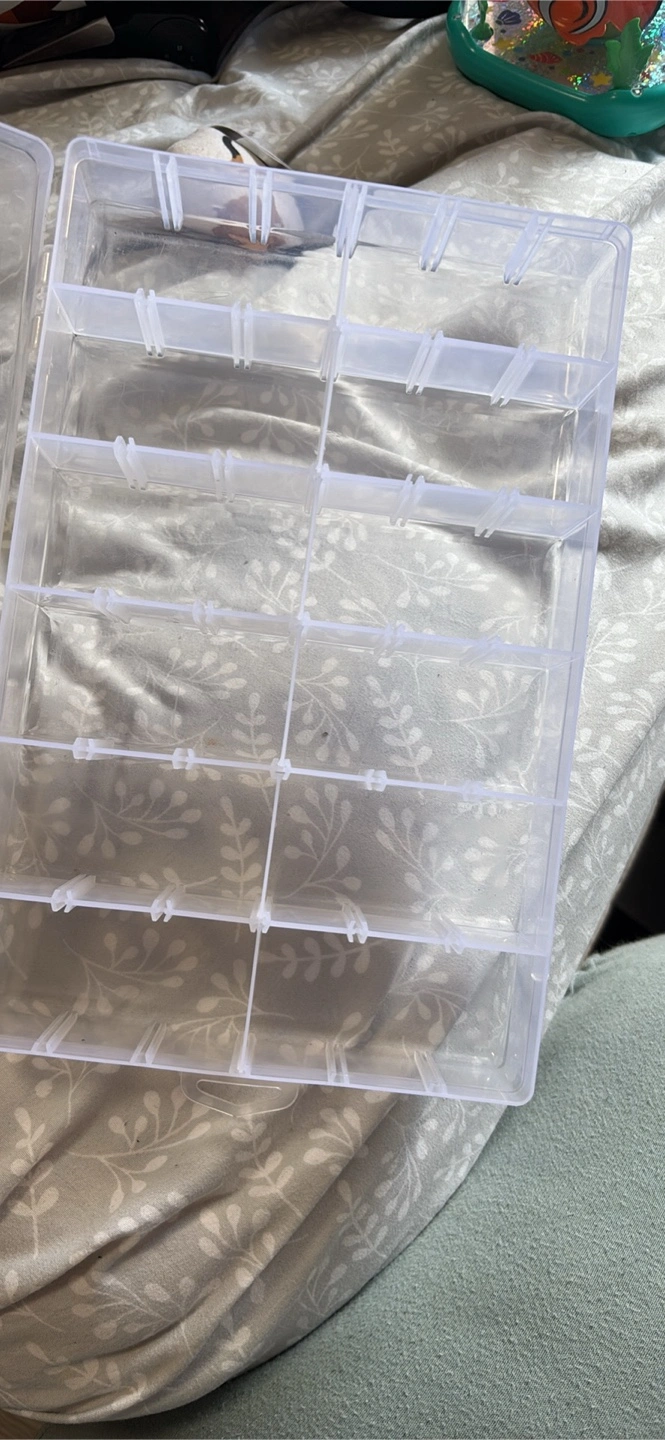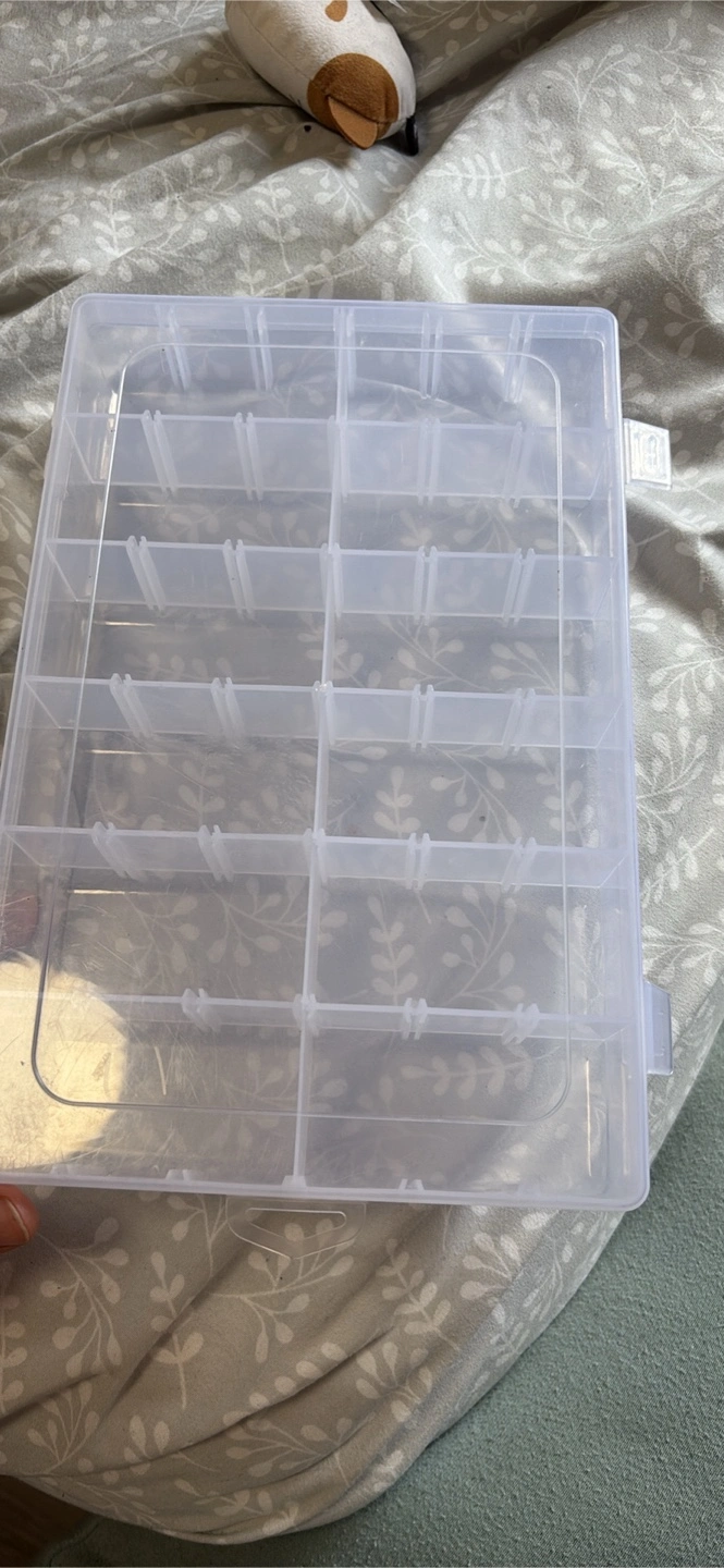 Here's a clear plastic organizer with adjustable compartments! It's perfect for storing beads, small parts, or anything else you need to keep tidy. It's in great shape and ready for a new home