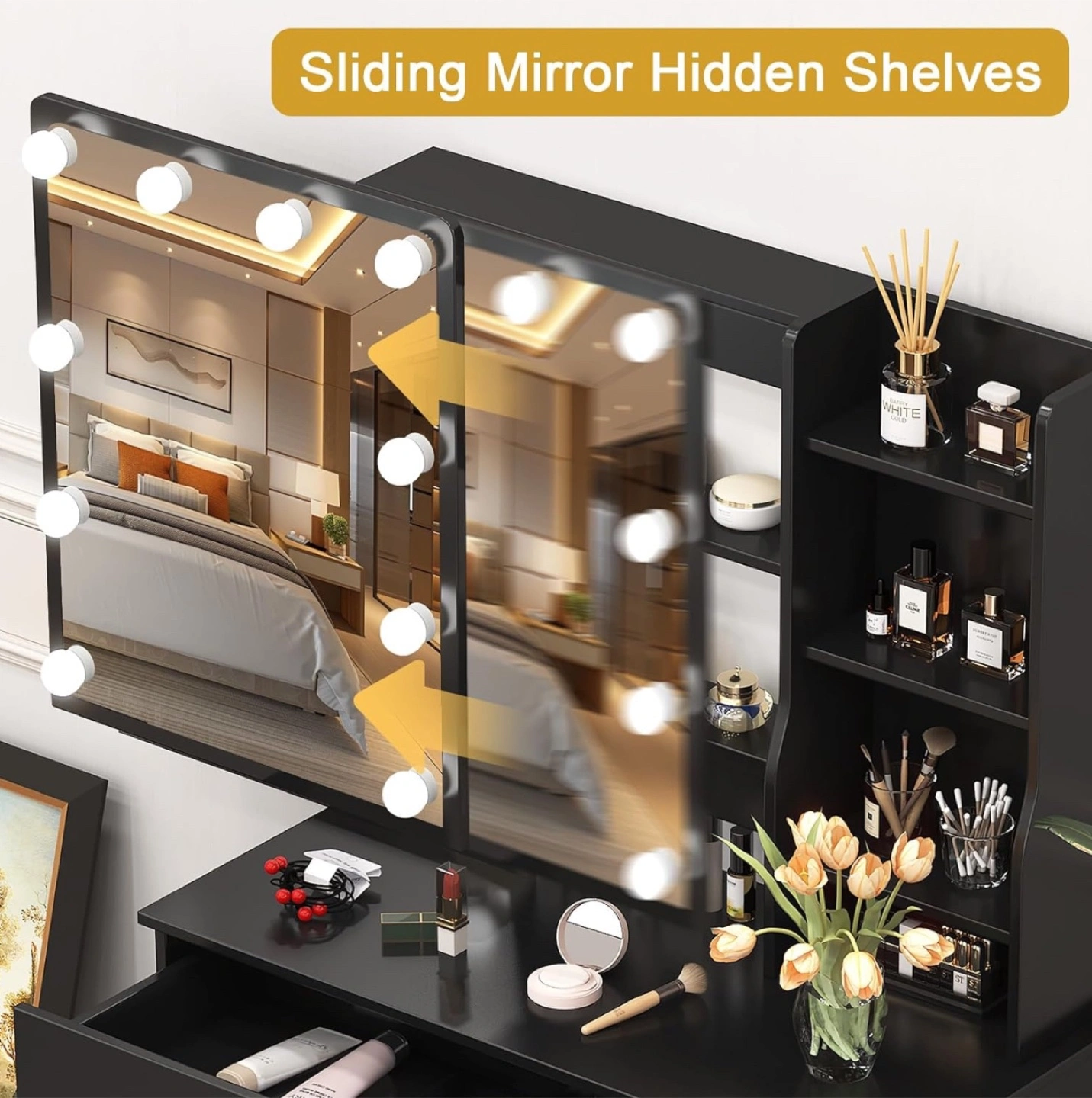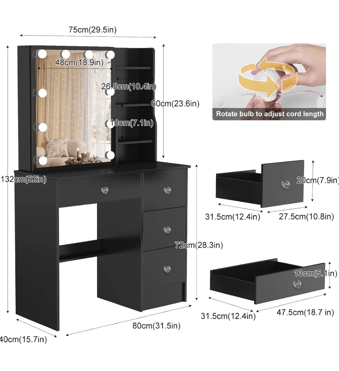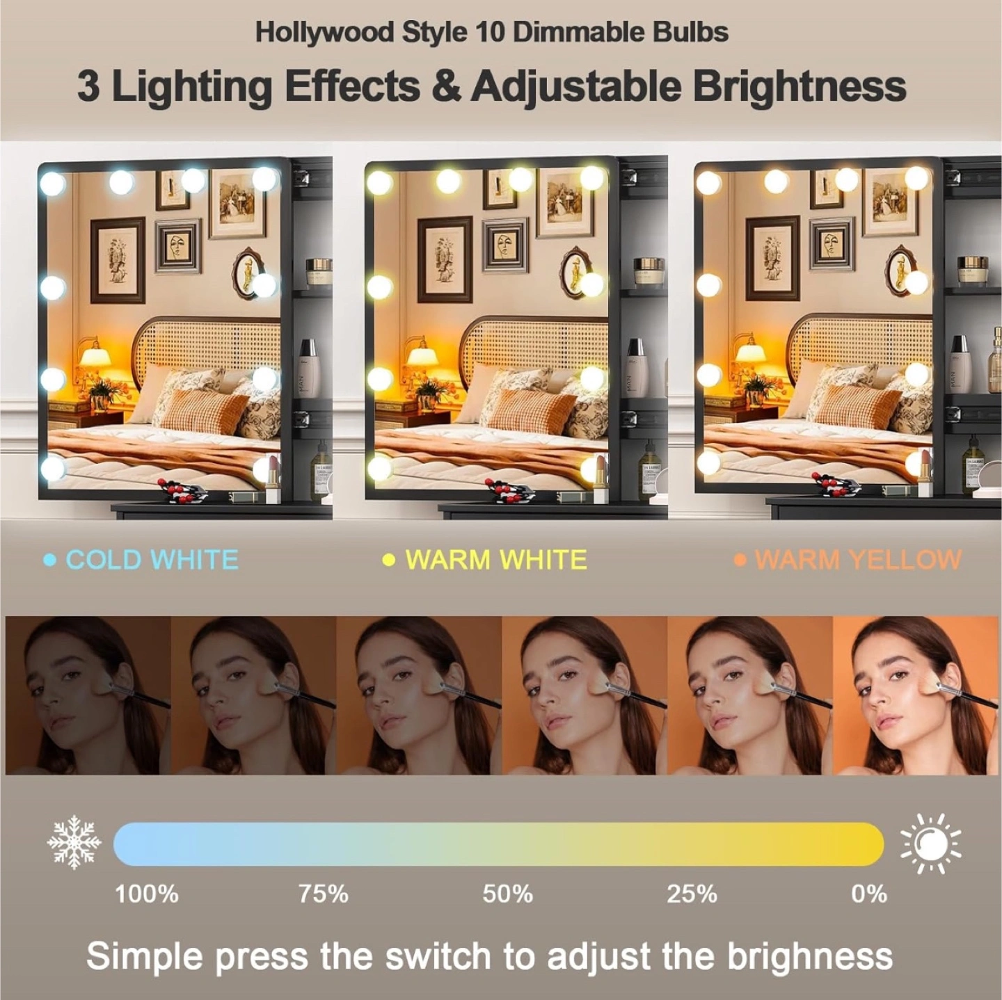 Looking to add a touch of Hollywood glamour to your space? This vanity table features a lighted mirror with 10 dimmable bulbs and 3 lighting effects (cold white, warm white, warm yellow). It also includes adjustable brightness, sliding mirror hidden shelves, 3-tier side shelves, 3 hidden shelves, 1 large drawer, and 3 short drawers. Dimensions are approximately 75cm (29.5in) wide and 132cm (52in) tall
