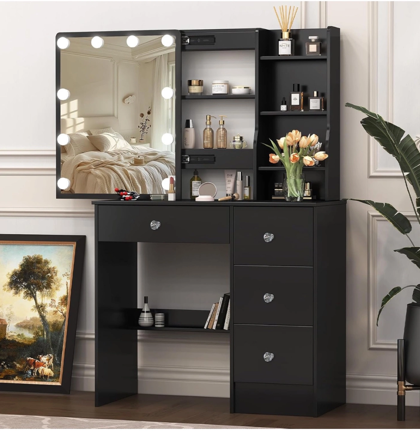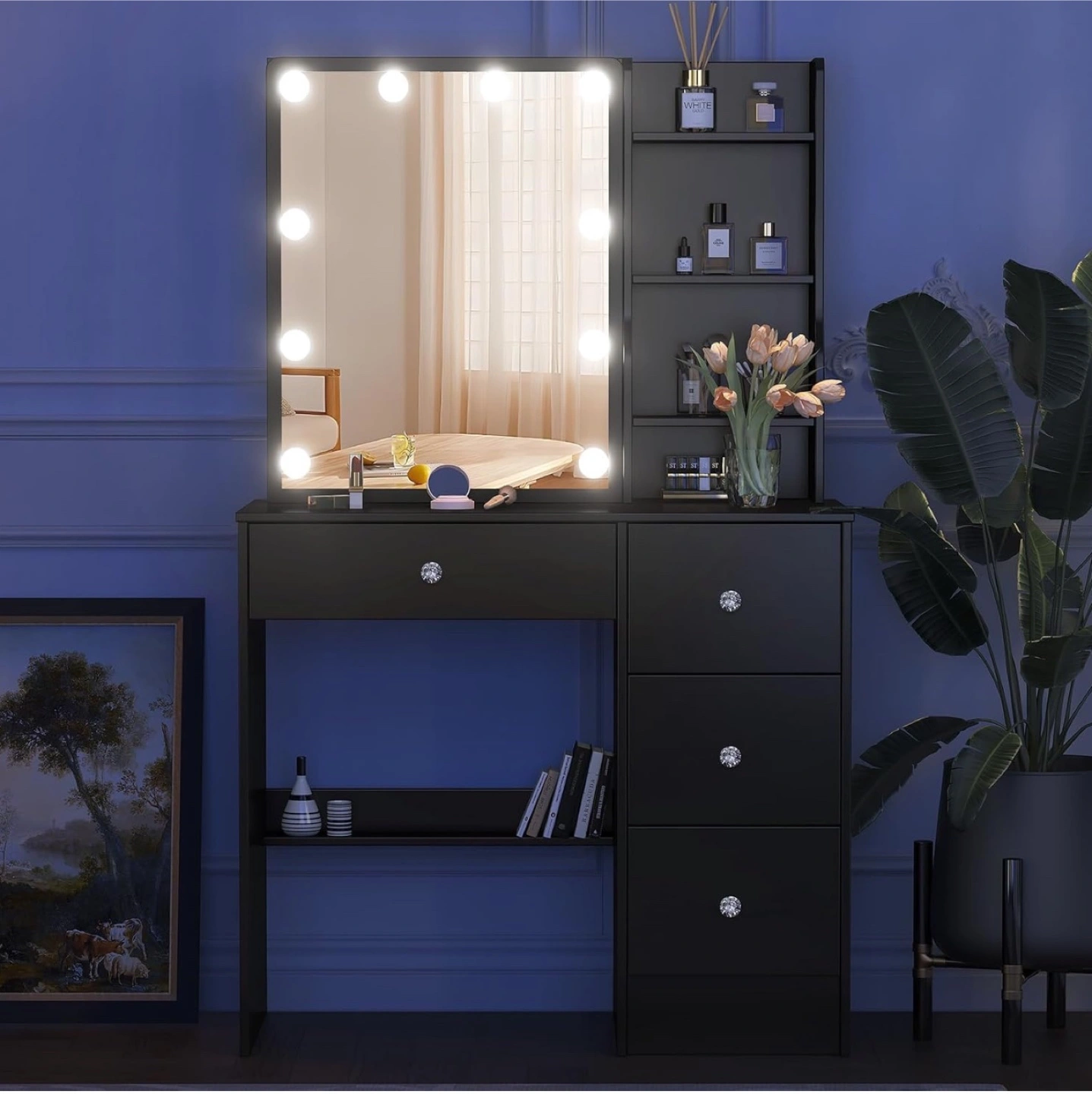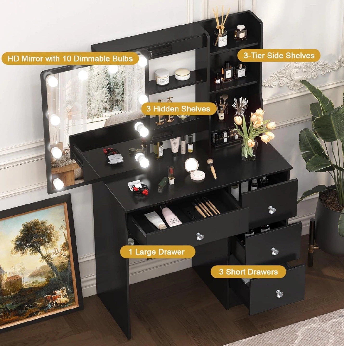 Looking to add a touch of Hollywood glamour to your space? This vanity table features a lighted mirror with 10 dimmable bulbs and 3 lighting effects (cold white, warm white, warm yellow). It also includes adjustable brightness, sliding mirror hidden shelves, 3-tier side shelves, 3 hidden shelves, 1 large drawer, and 3 short drawers. Dimensions are approximately 75cm (29.5in) wide and 132cm (52in) tall