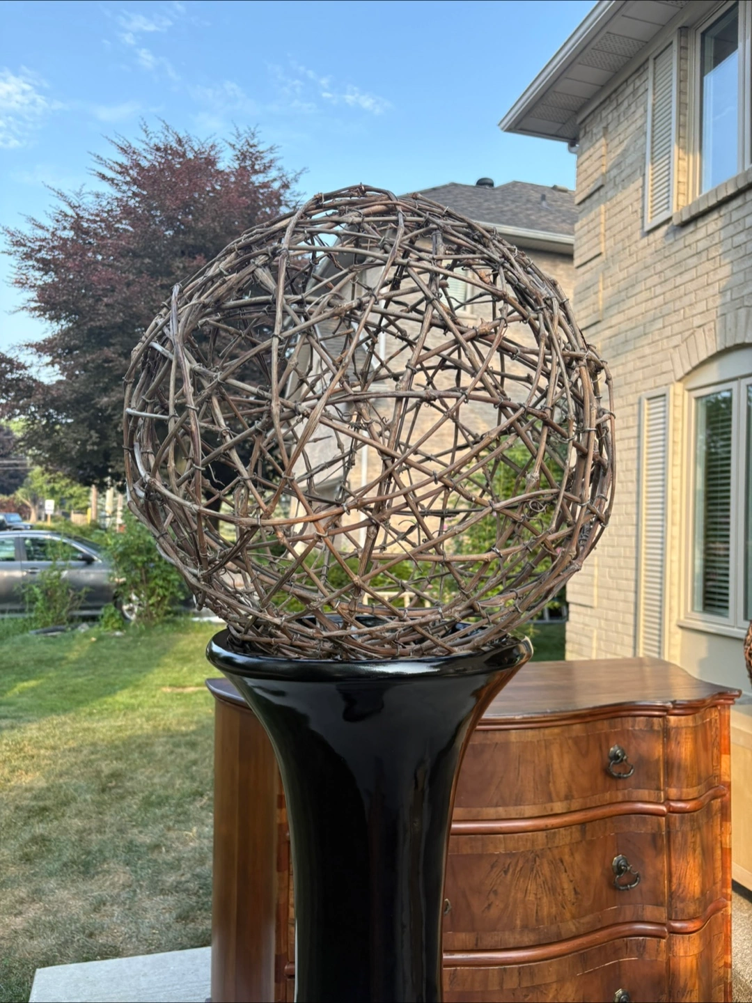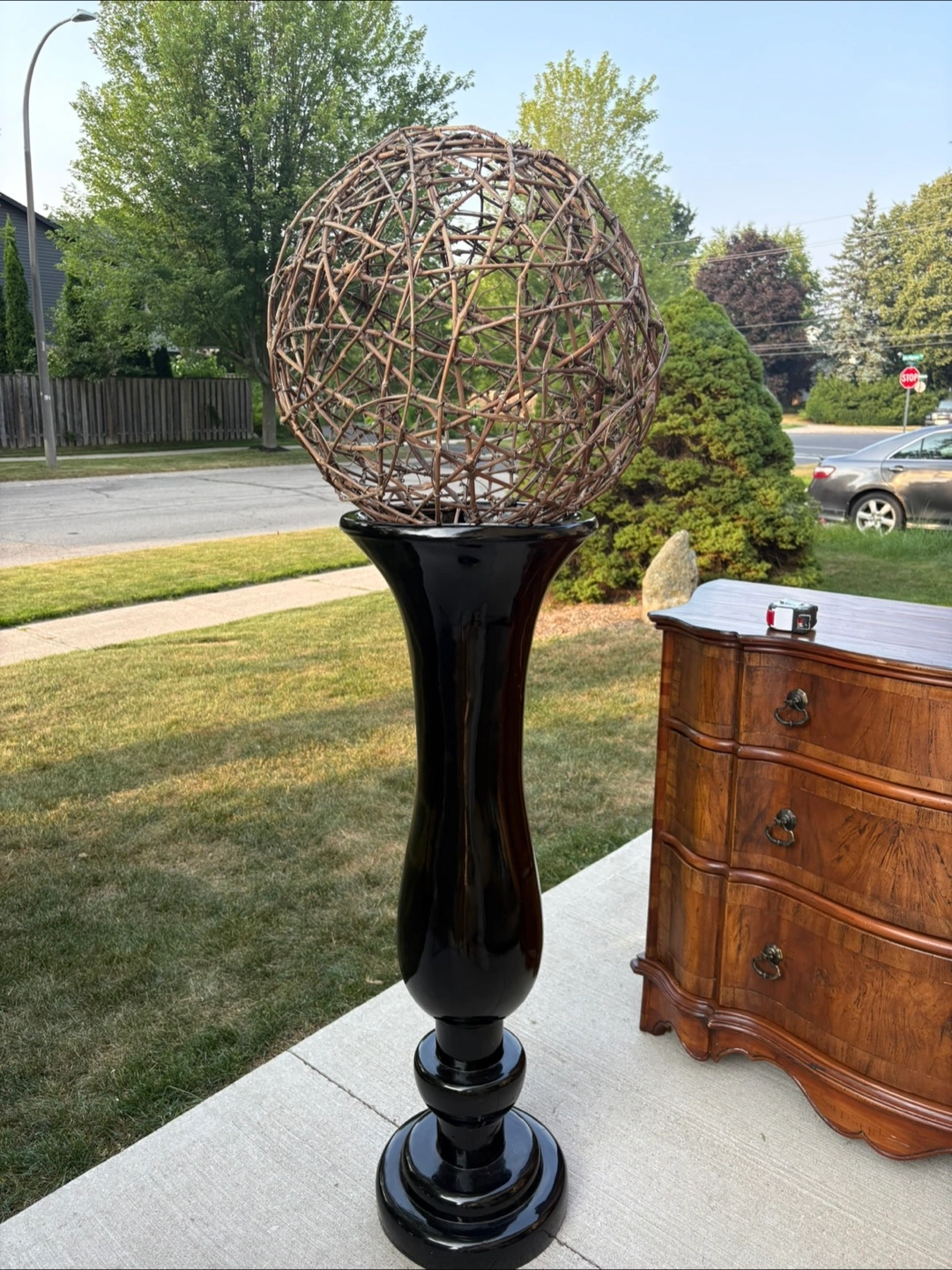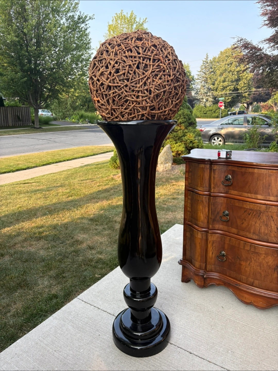 Selling a decorative black vase with a wicker ball on top. It's in great shape and would look lovely in any home. 45” Tall, two bases being the same height and two different sized wicker balls eye!