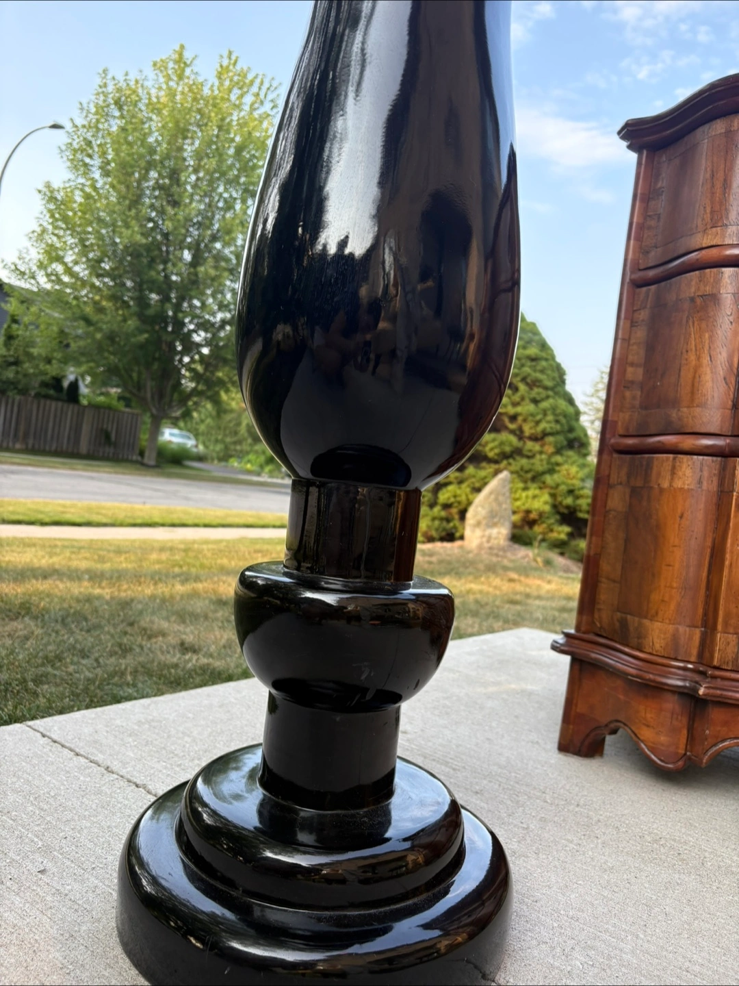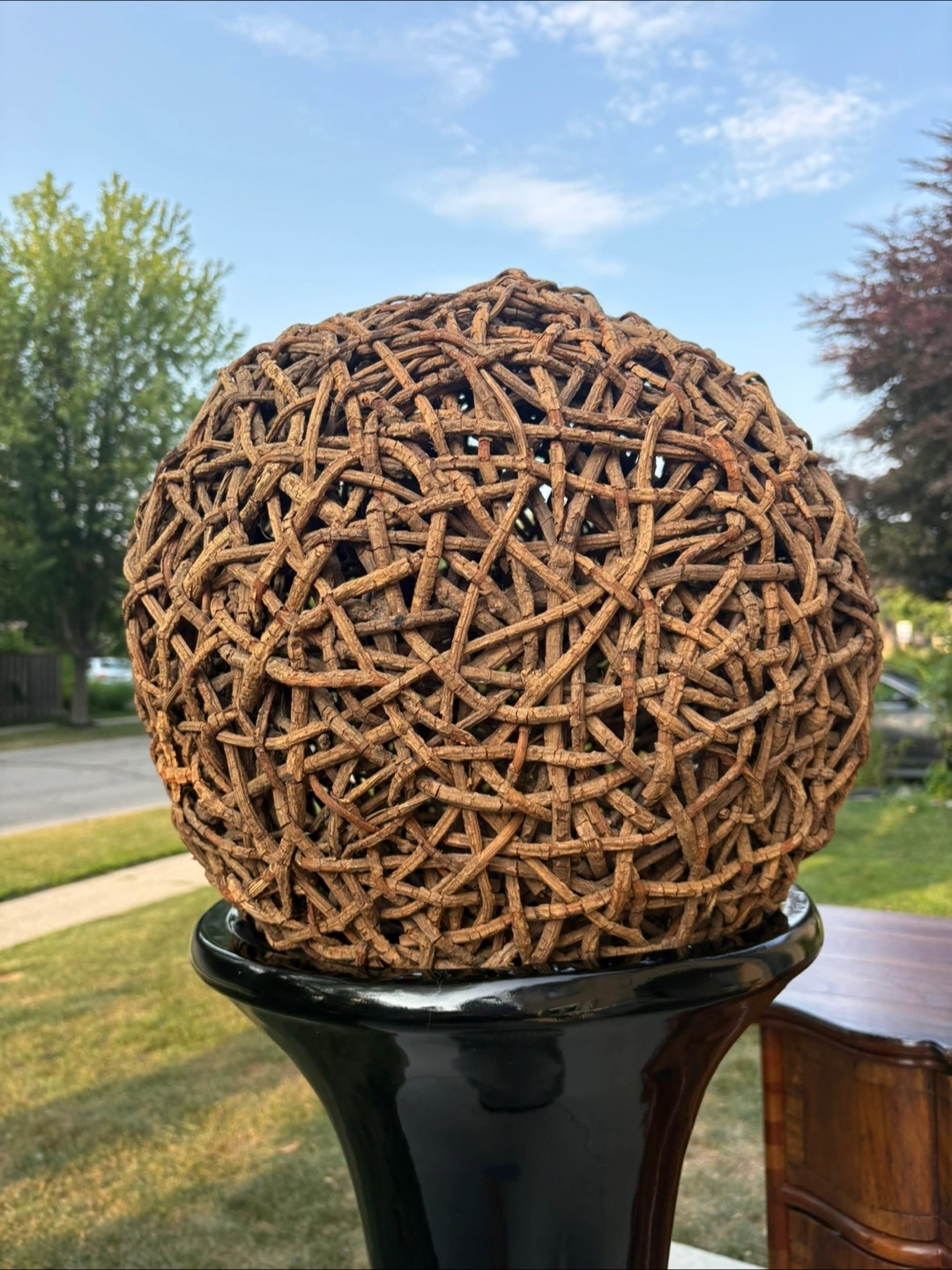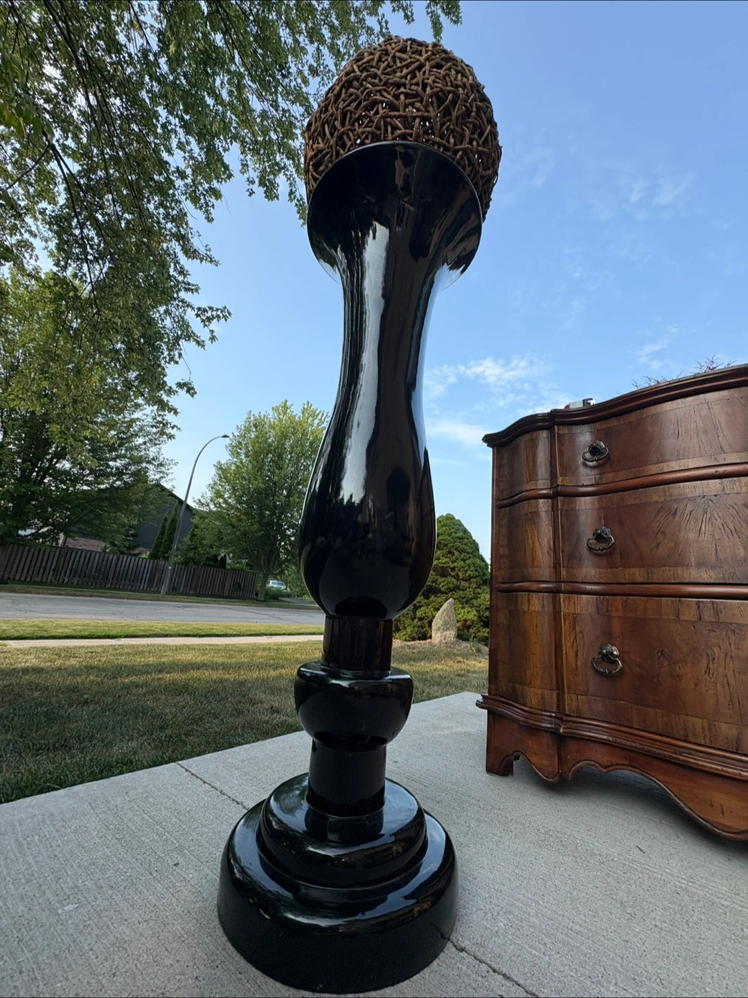 Selling a decorative black vase with a wicker ball on top. It's in great shape and would look lovely in any home. 45” Tall, two bases being the same height and two different sized wicker balls eye!