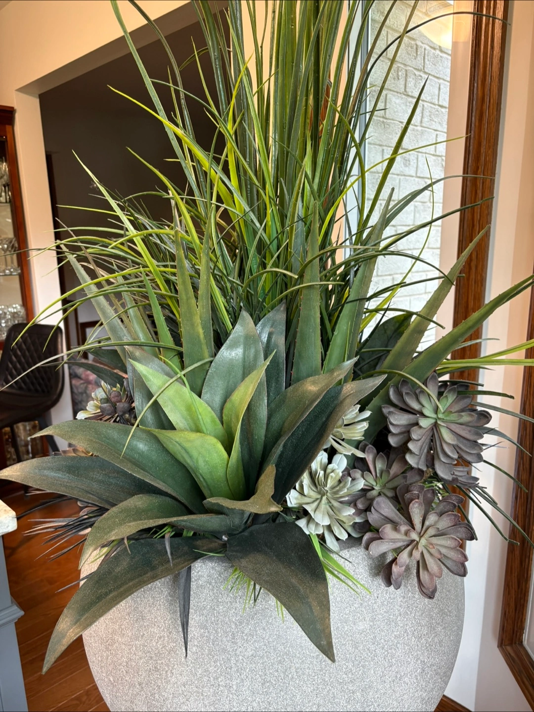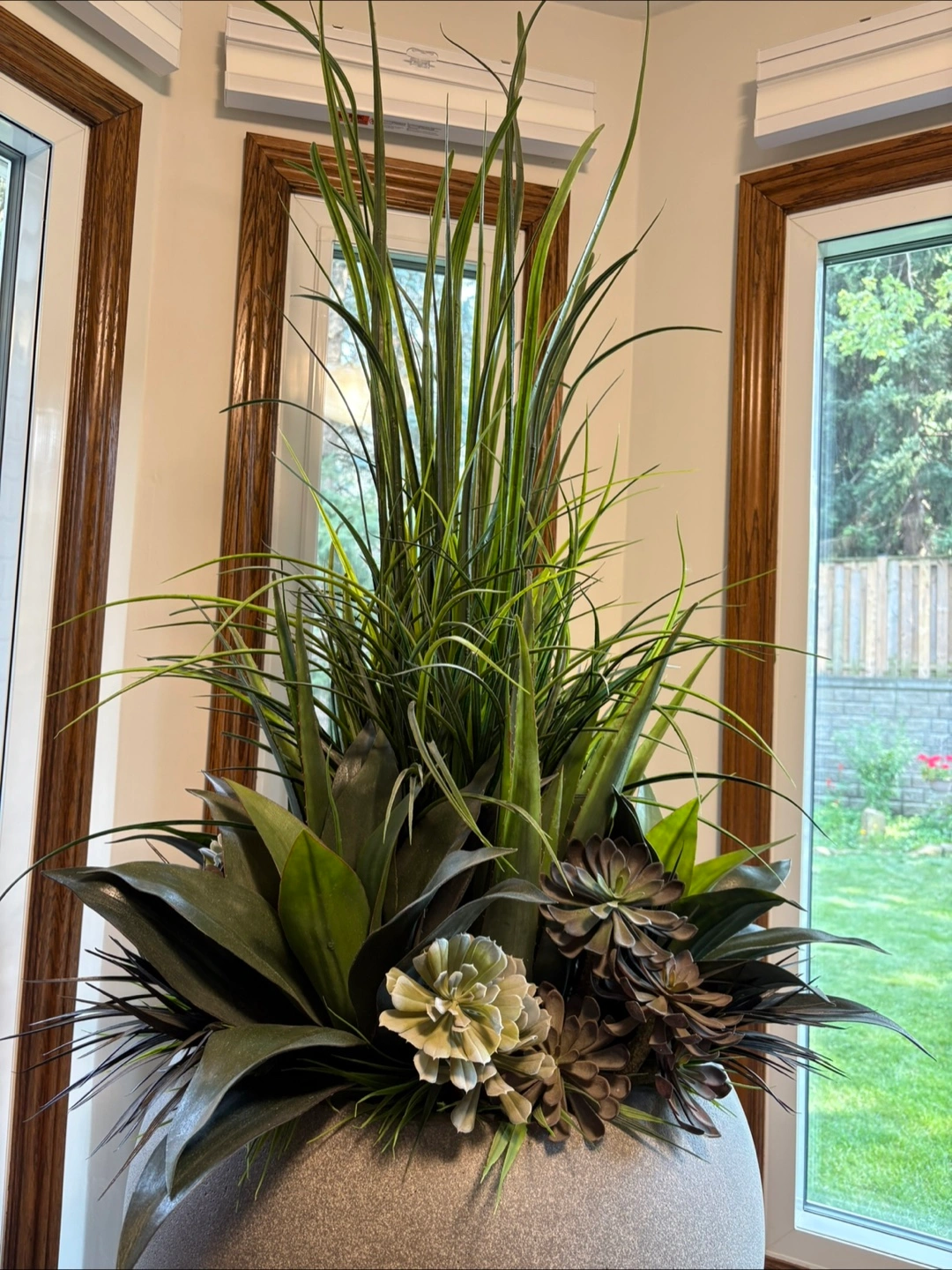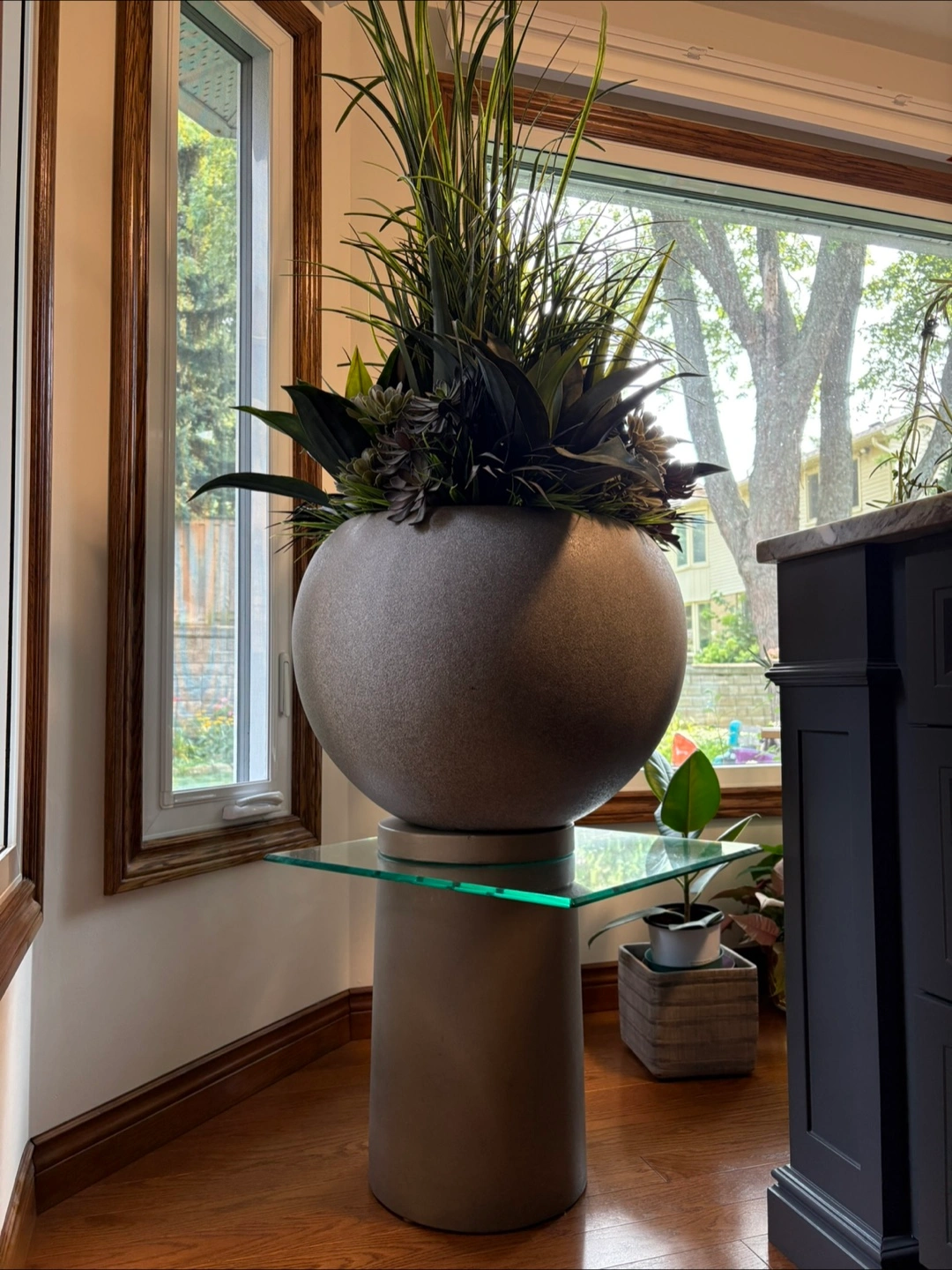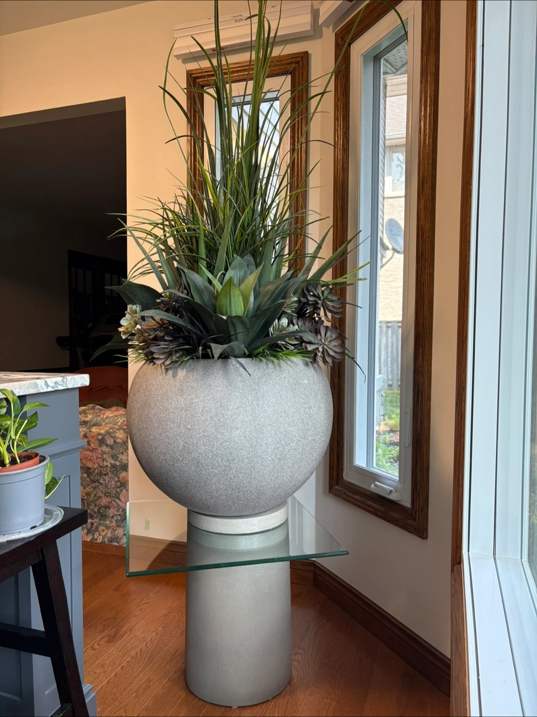 Beautiful, high-quality 7ft tall fake plant in a sleek black 16×16″ planter. Realistic leaves, sturdy build, and decorative glass accents. Perfect for home, office, or lobby—no maintenance needed.