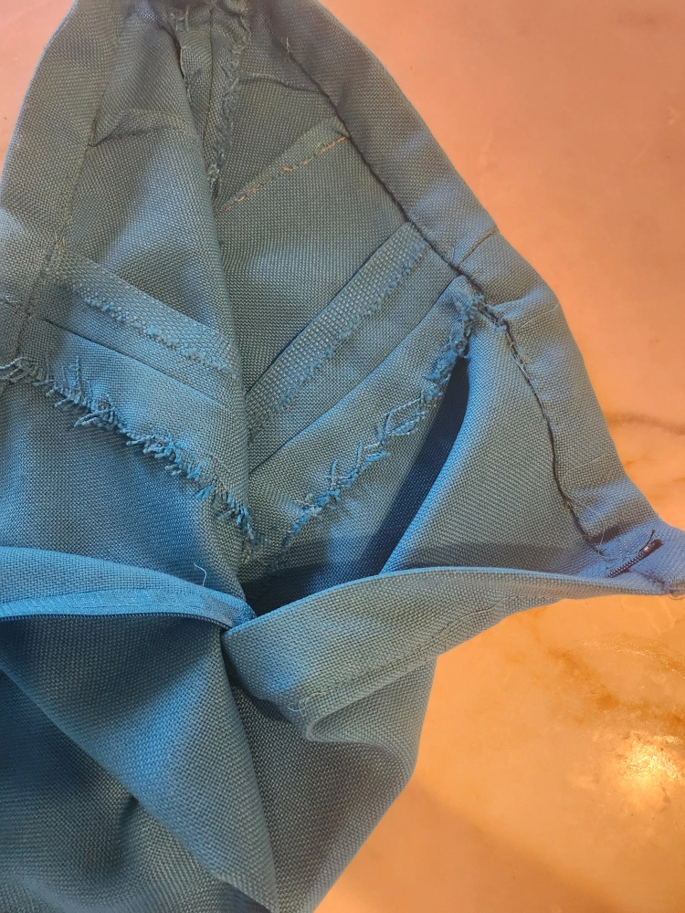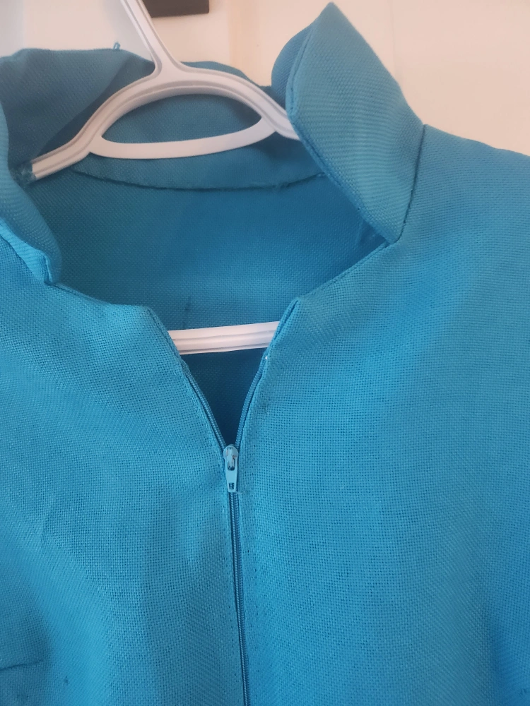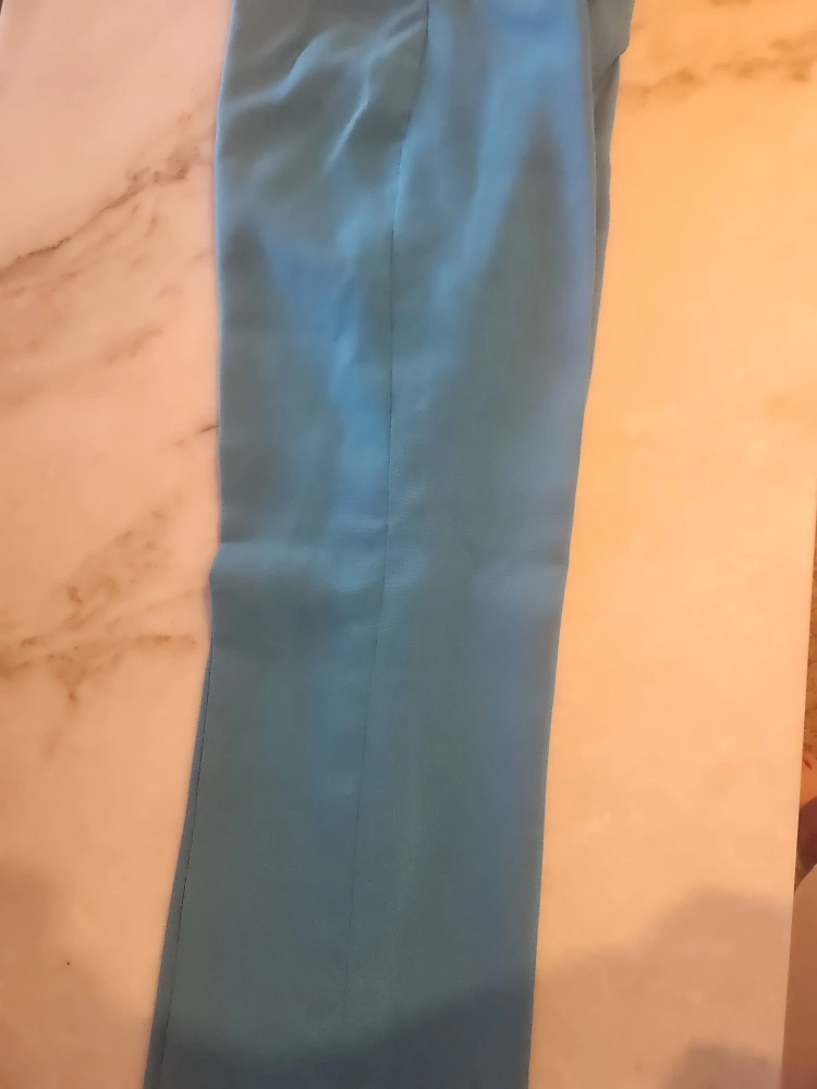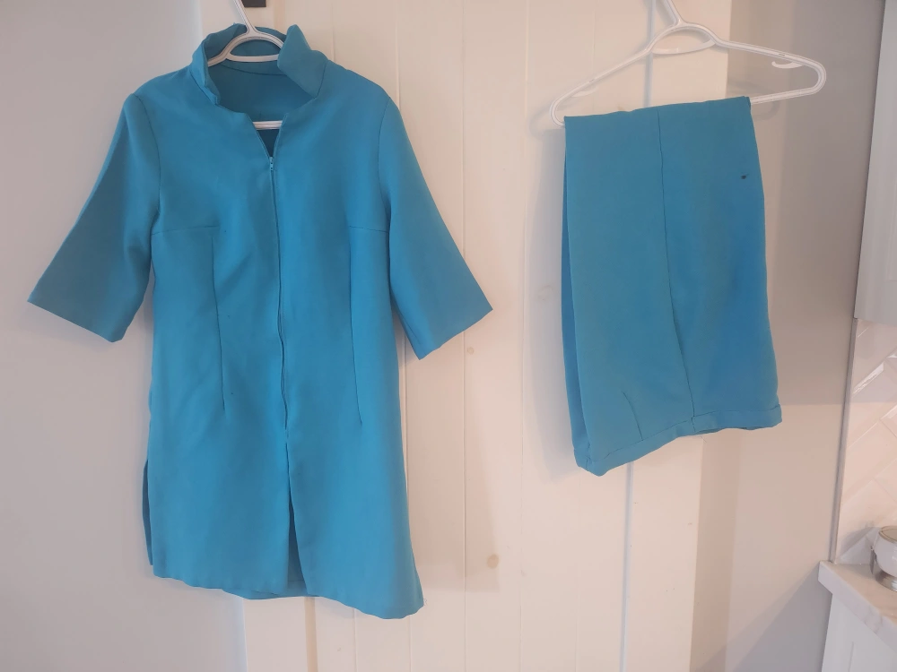 Here's a blue two-piece suit. It's in used condition, with some wear and tear visible in the photos. Perfect for someone looking for a unique vintage piece!