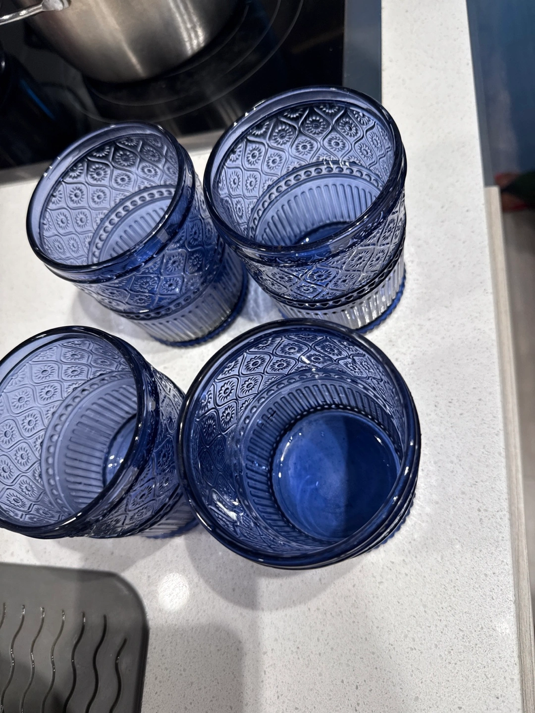 Selling a set of four beautiful blue drinking glasses. They have a lovely textured design that adds a touch of elegance to any table. Perfect for everyday use or special occasions!