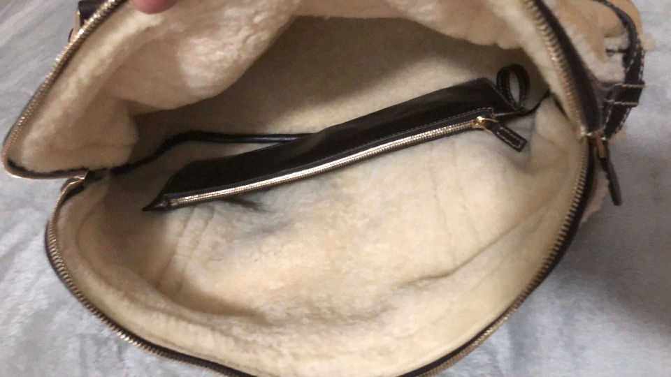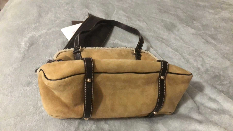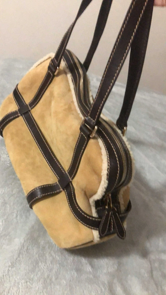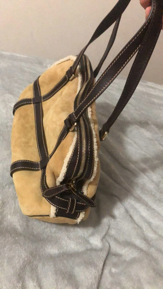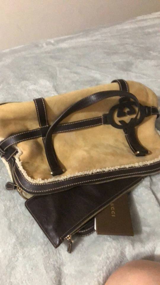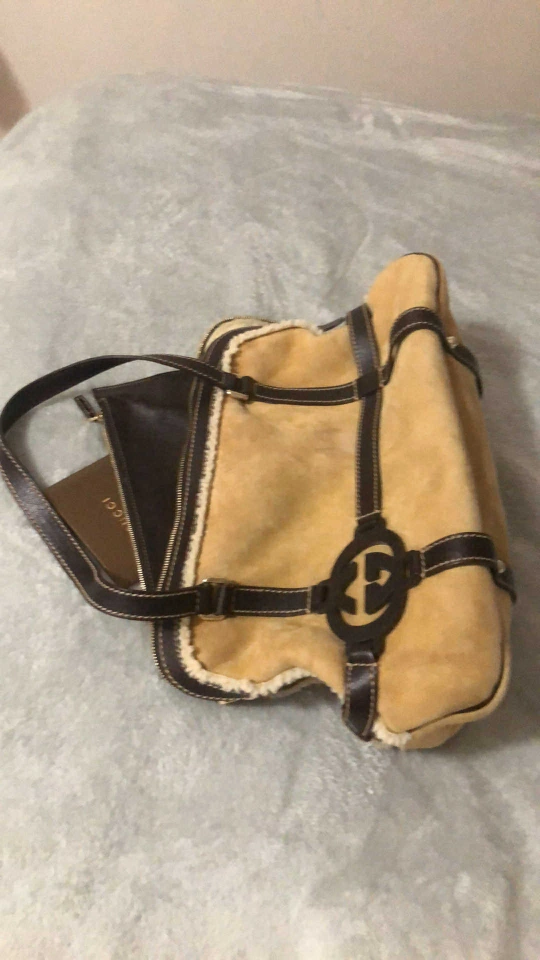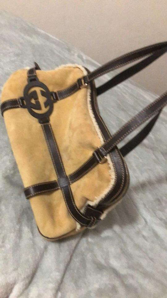 This is a Gucci shoulder bag made of suede and leather. It's in good condition and has a unique design with dark brown leather straps. The inside is lined with fur