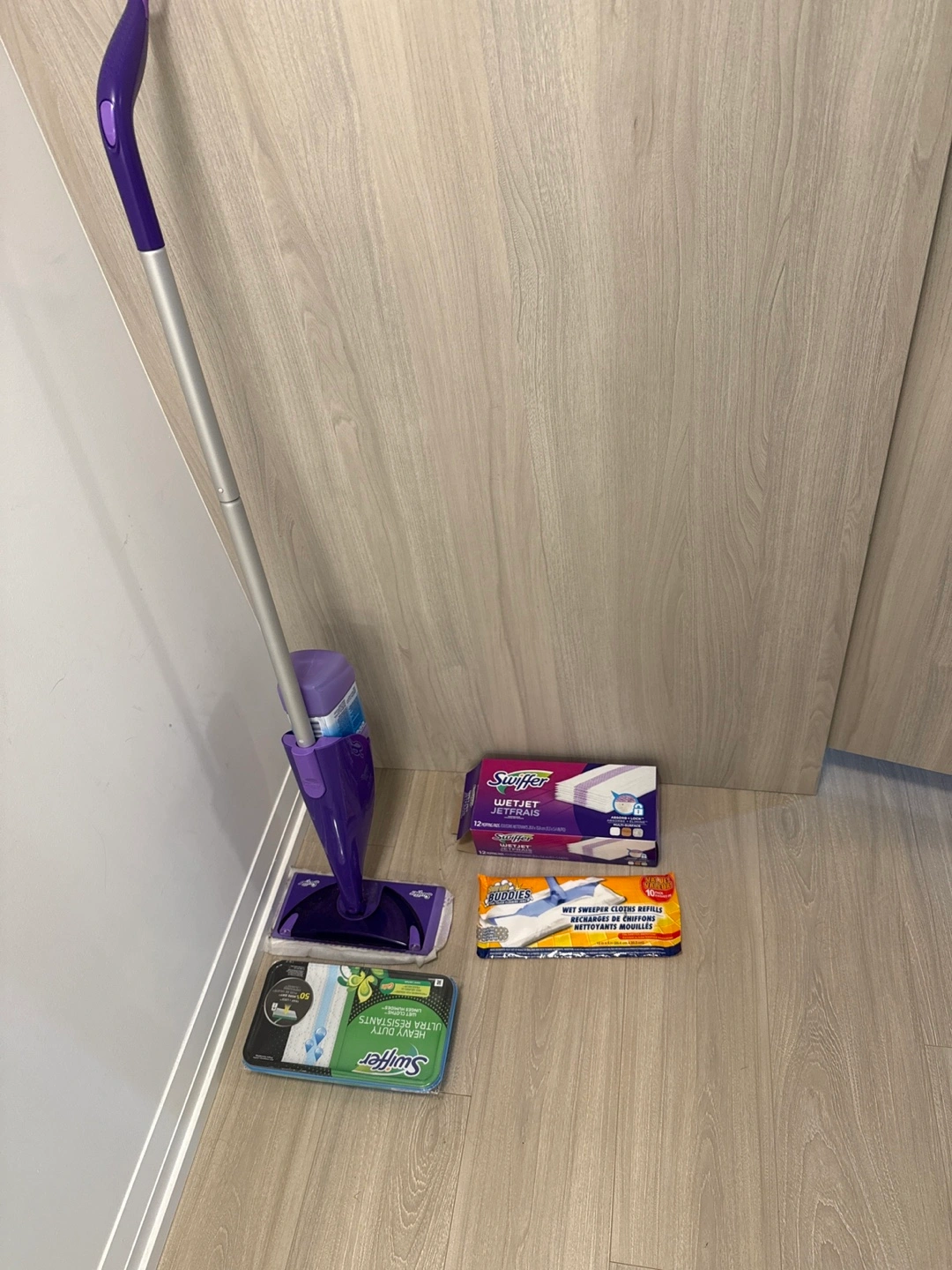 Selling a Swiffer WetJet mop in purple, complete with a variety of refills! You'll get the mop itself plus Swiffer WetJet refills, Swiffer Heavy Duty refills, and Buddies wet sweeper cloths refills. Everything you need to keep your floors sparkling clean!