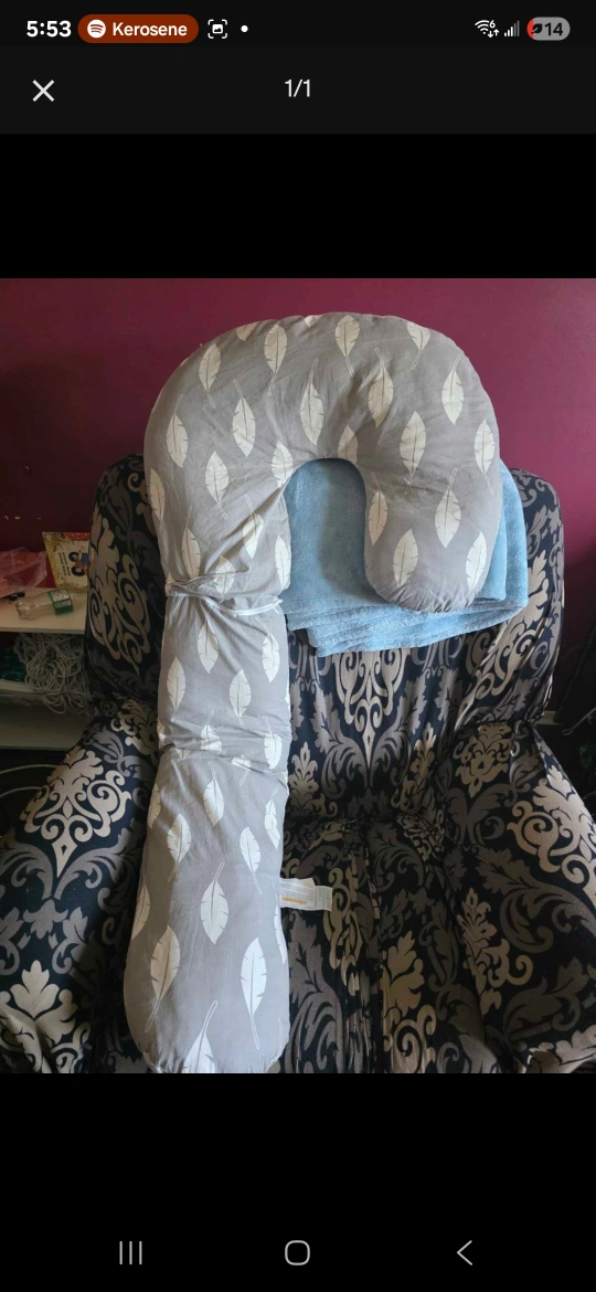 Selling a pregnancy pillow with a grey and white feather print. It's in good condition and ready to help someone get a more comfortable sleep!