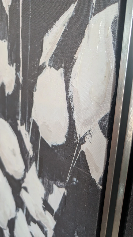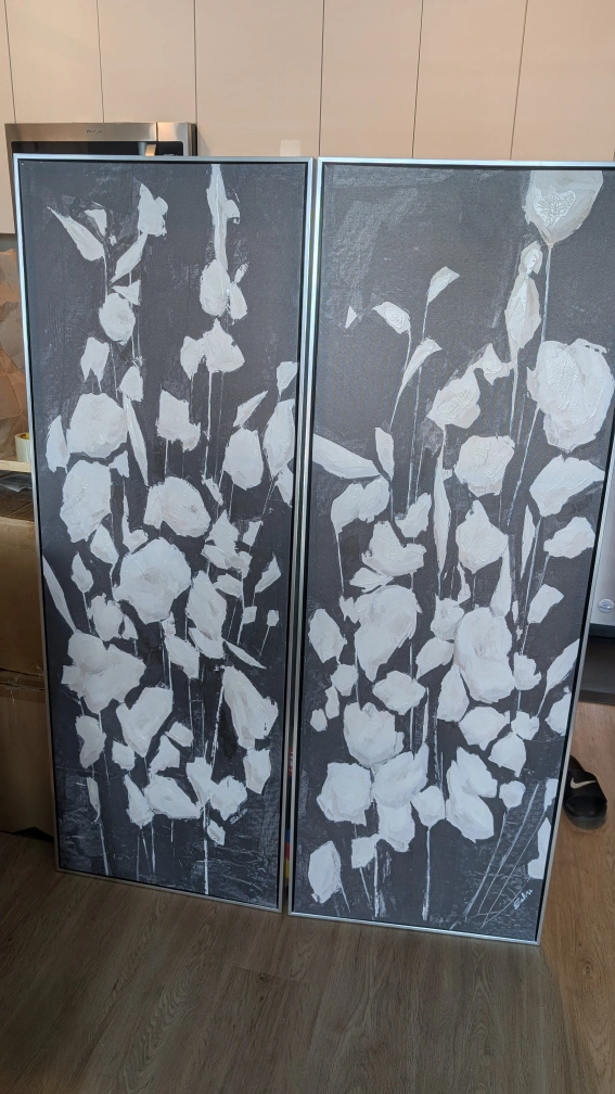 Selling a set of two floral canvas wall art pieces. They feature a grey and white floral design with a silver frame. There is some minor damage on one of the frames (see photos). Otherwise, they are in good condition and ready to hang! cash only pickup
